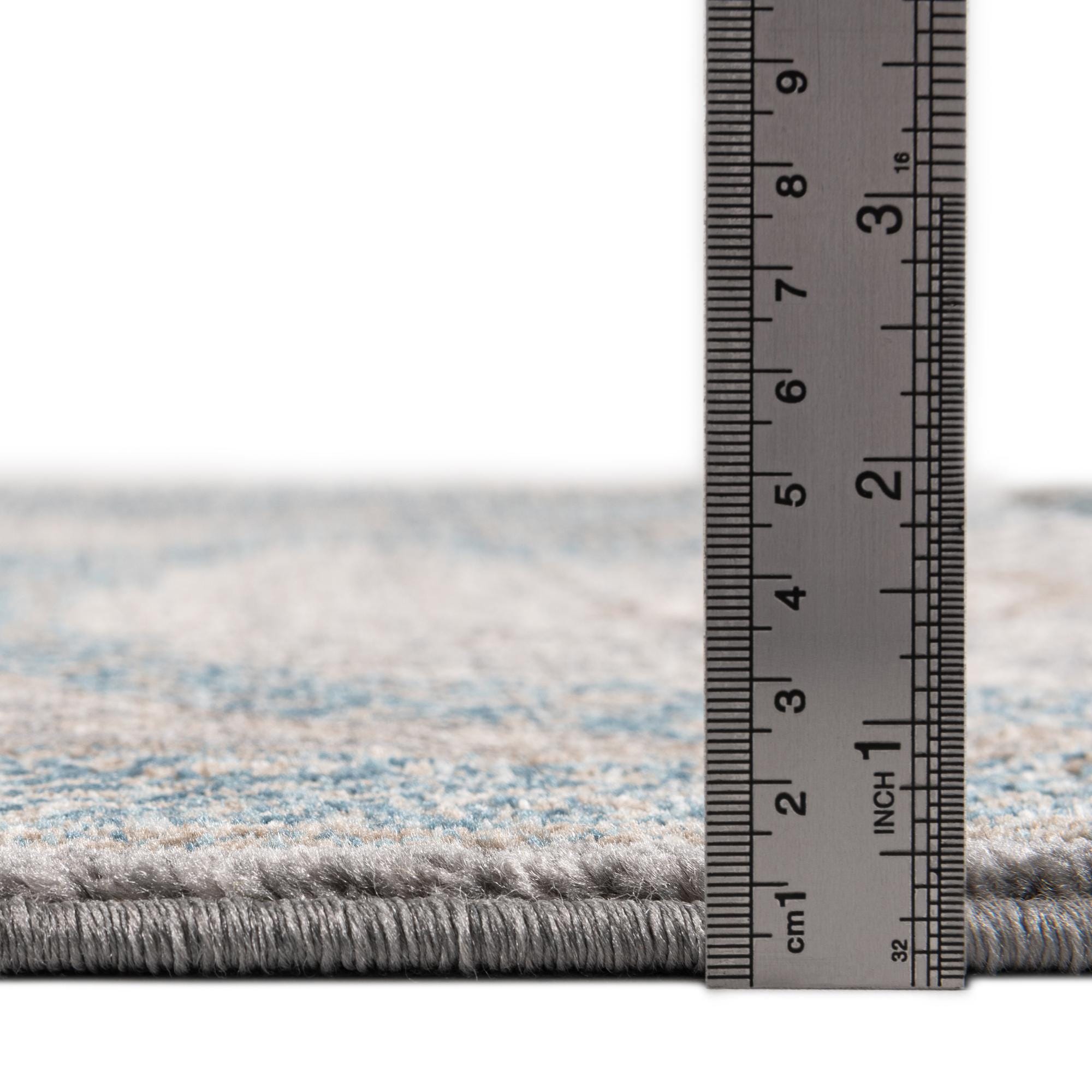 Primary color is Blue. Colors in this rug include: Blue, Ivory, Gray.