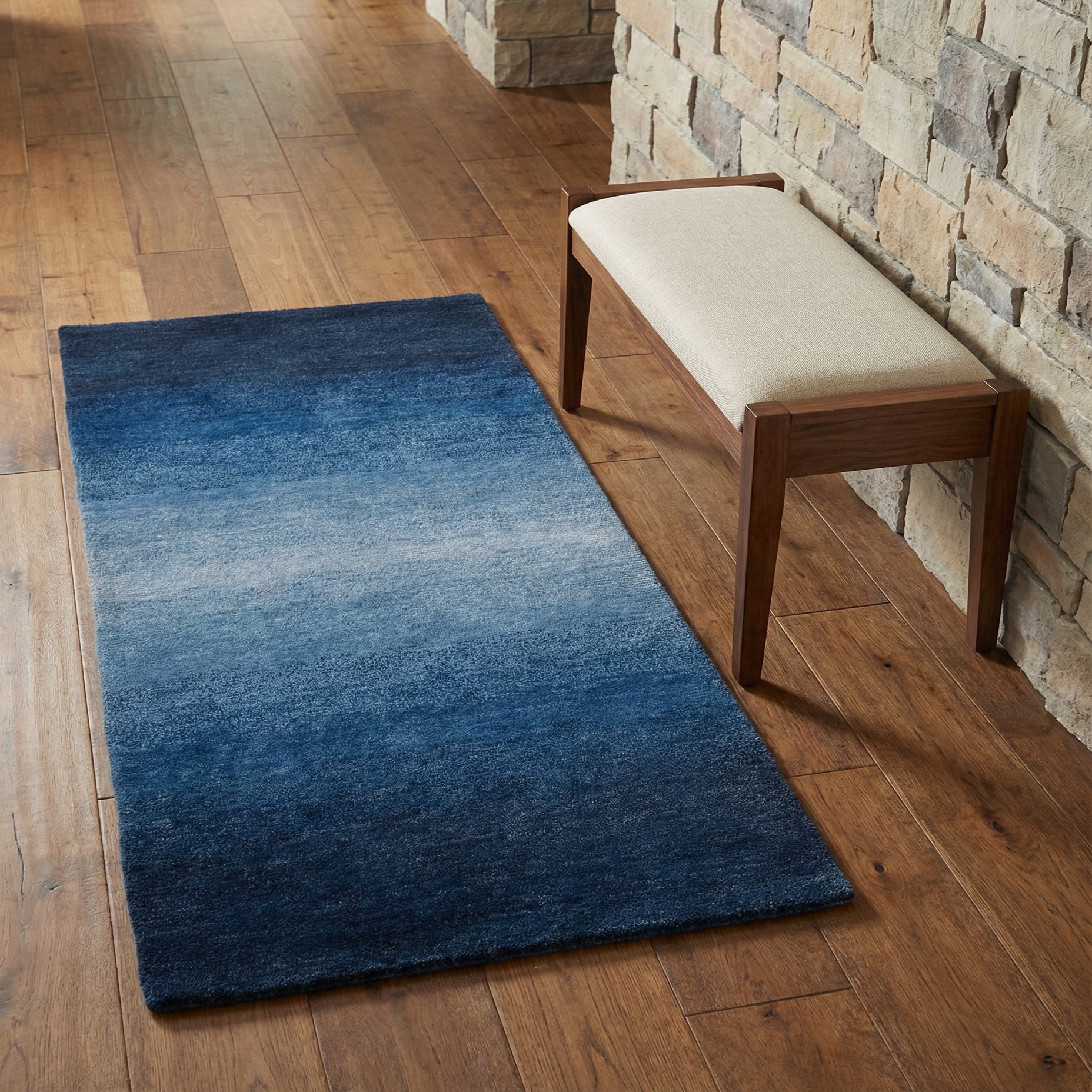 This runner fits well in contemporary, transitional, or coastal interiors where a calm, layered color palette is desired. Use it to anchor a hallway or entry, line the side of a bed, or add depth along a narrow kitchen aisle; it pairs especially well with light woods, white or warm gray walls, and metal accents in brass or matte black. The understated gradient brings color without competing with patterned furnishings, making it easy to layer with textured throws, solid upholstery, or simple geometric accessories.