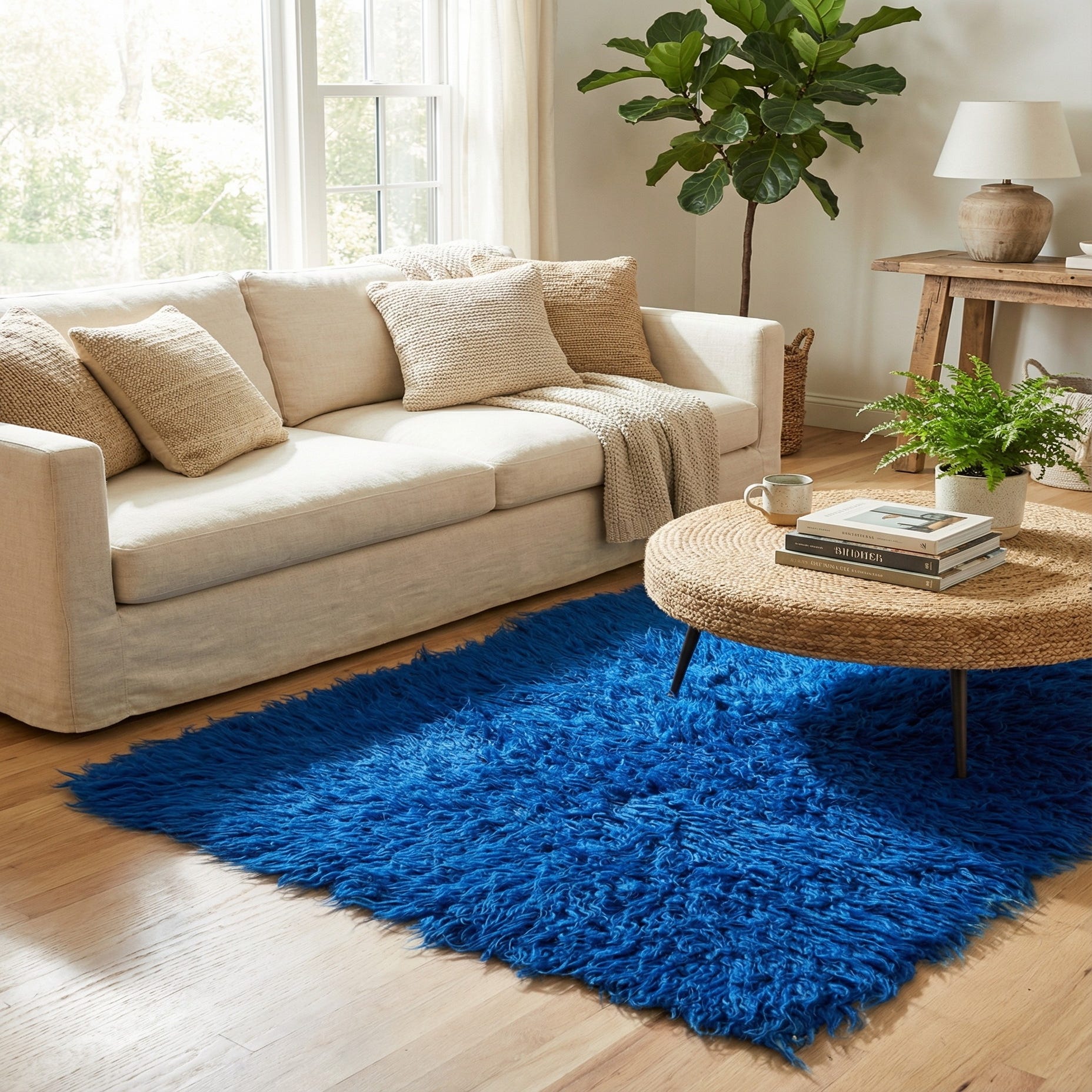 A vibrant blue 5 ft runner rug with a shaggy, high pile texture, perfect for a hallway.