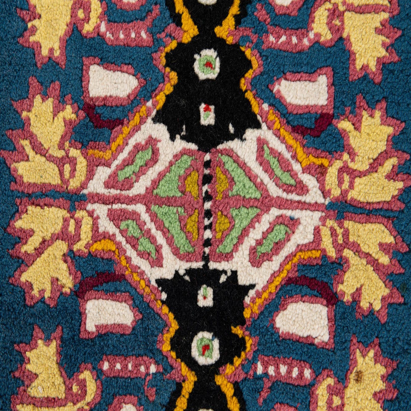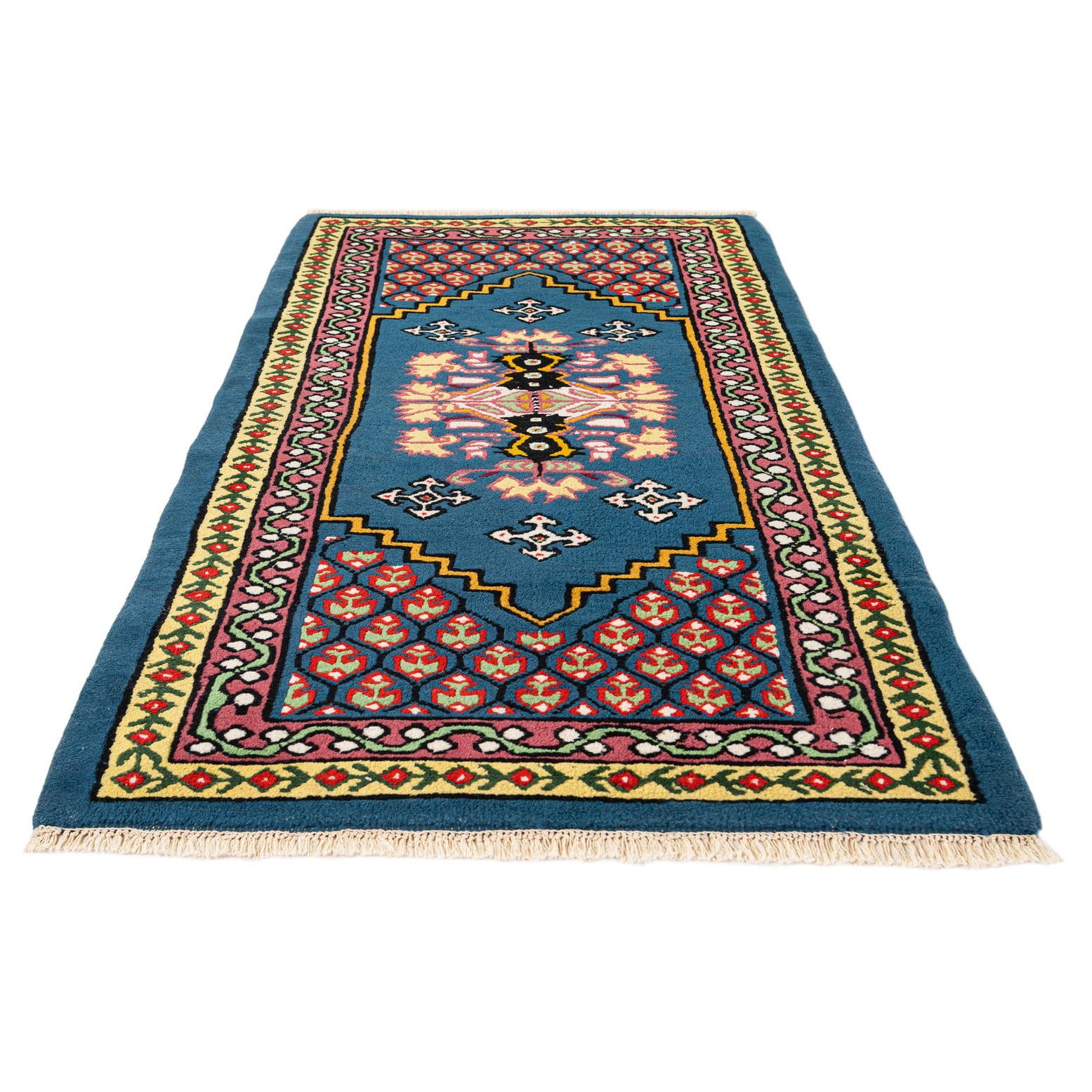 A 5 ft runner rug with a deep blue field, featuring a colorful traditional medallion and tribal patterns in red, green, yellow, and black, with a shag pile.