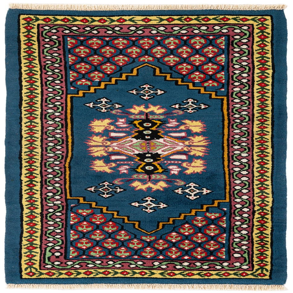 Primary color is Blue. Colors in this rug include: Blue, Green, Ivory, Red, Yellow, Pink.