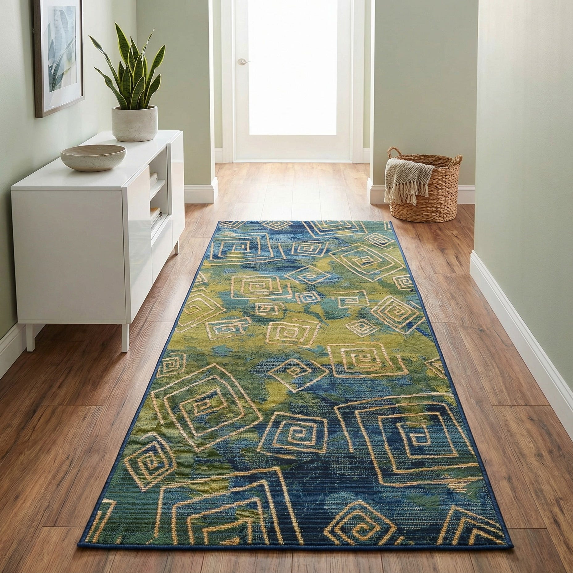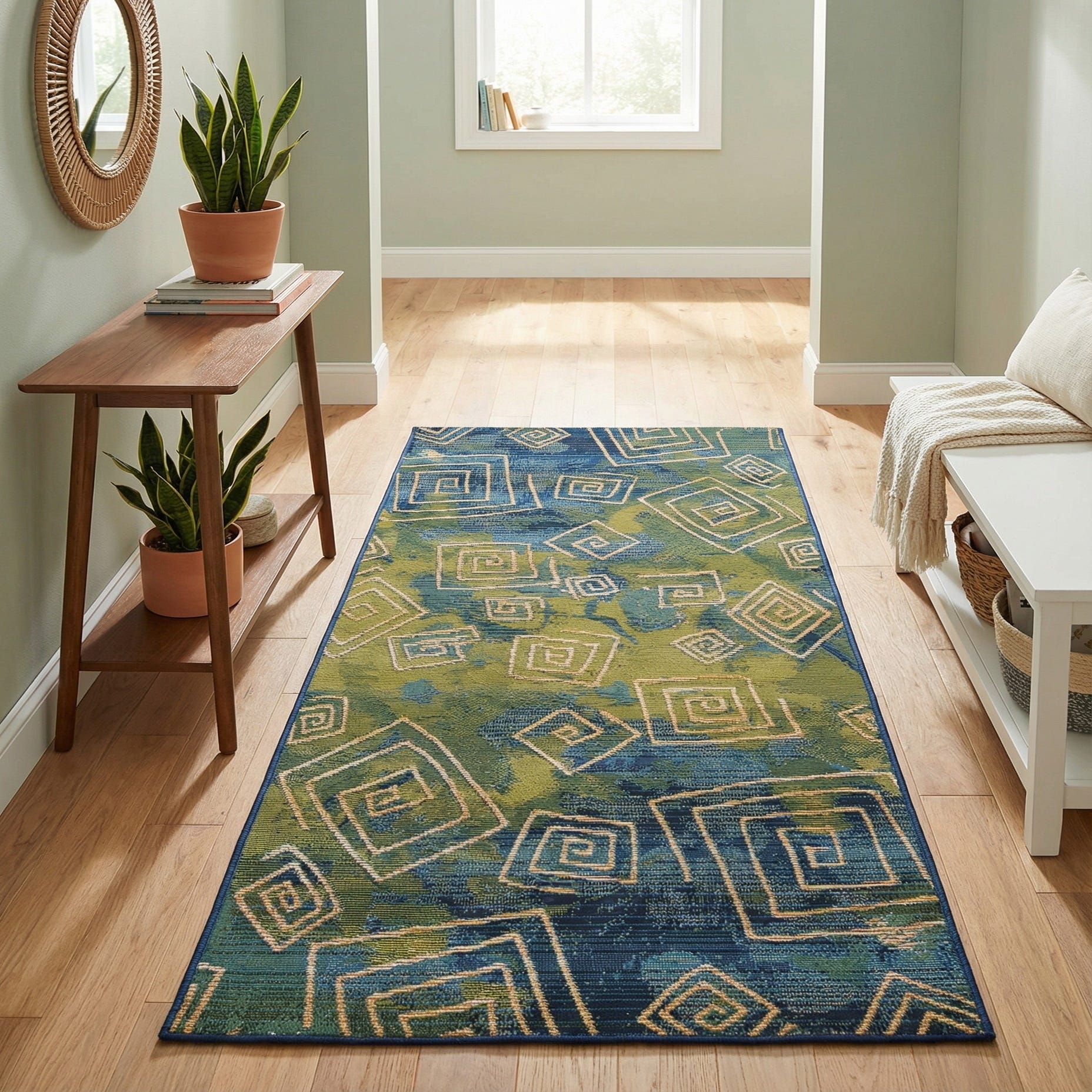 A 5 ft runner rug featuring an abstract tribal pattern with blue and green tones and light gold spiral squares.