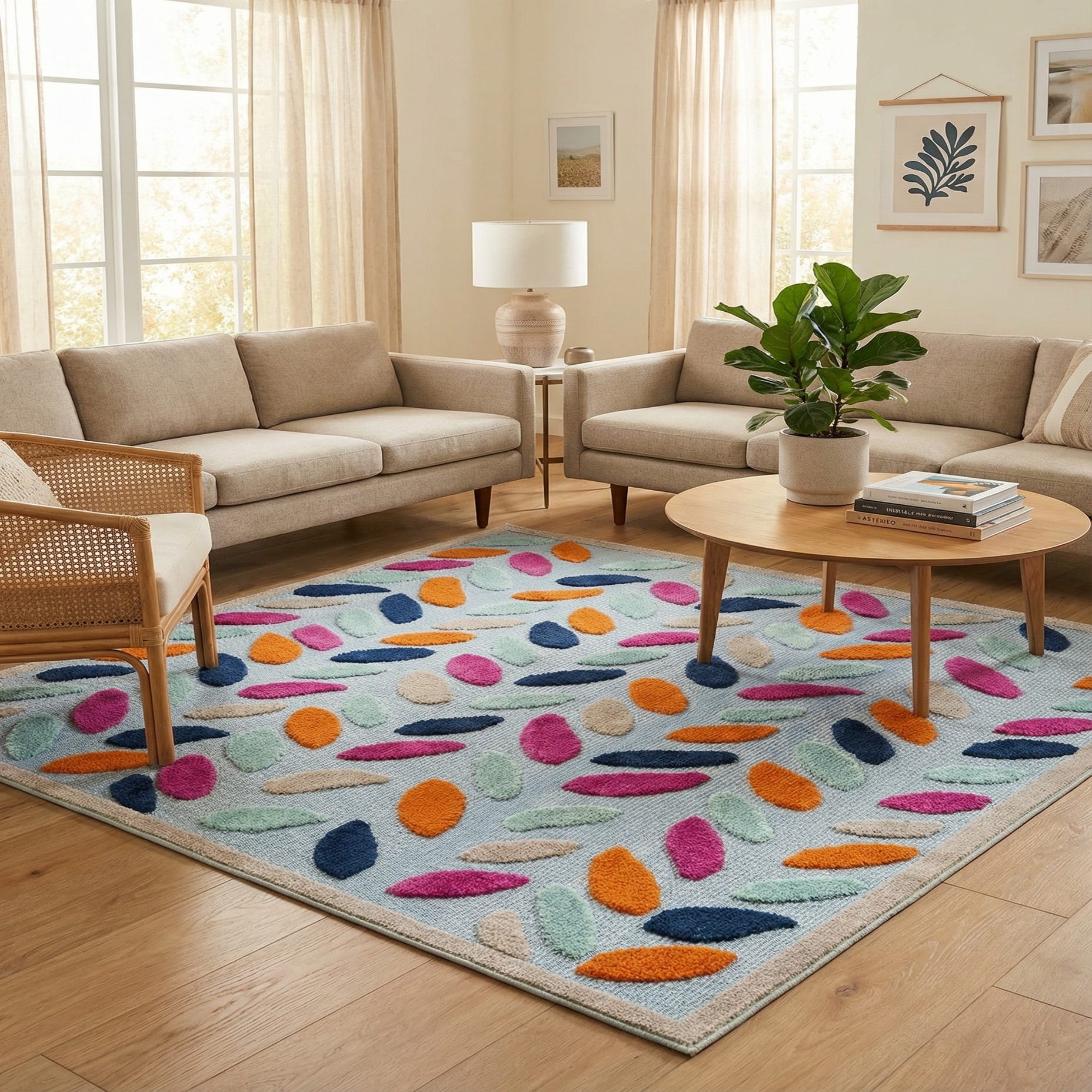 A playful, modern leaf motif rides across a soft blue field, each oval-shaped leaf cut in lively shades of navy blue, orange, pink, light blue, gold and gray. The pattern is arranged in offset rows for a sense of movement while maintaining an orderly, contemporary look. Running your hand over the surface, you’ll notice a subtle contrast between the low, woven background and the plush, raised cut-pile leaves — a tactile mix that invites bare feet and adds visual interest without heaviness.