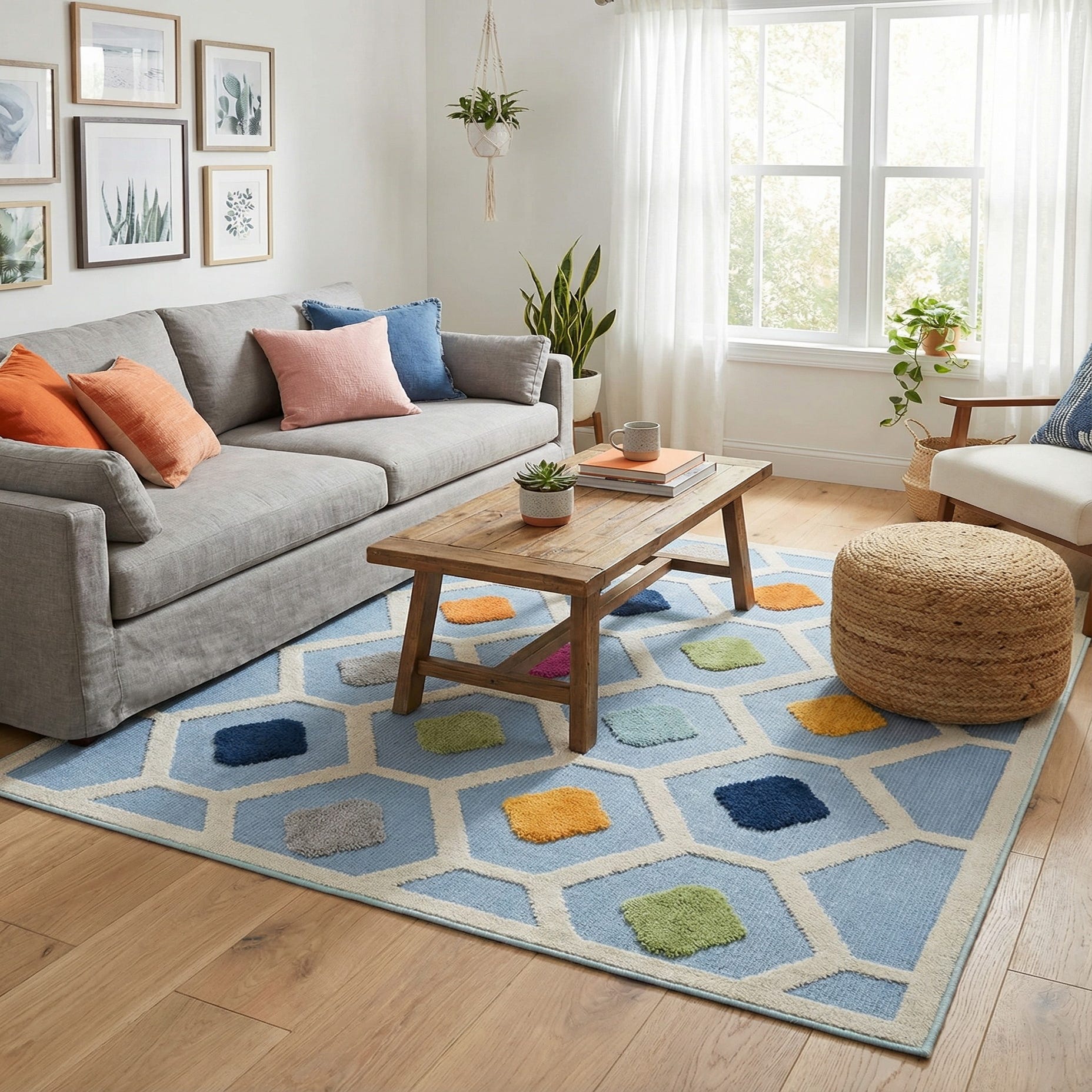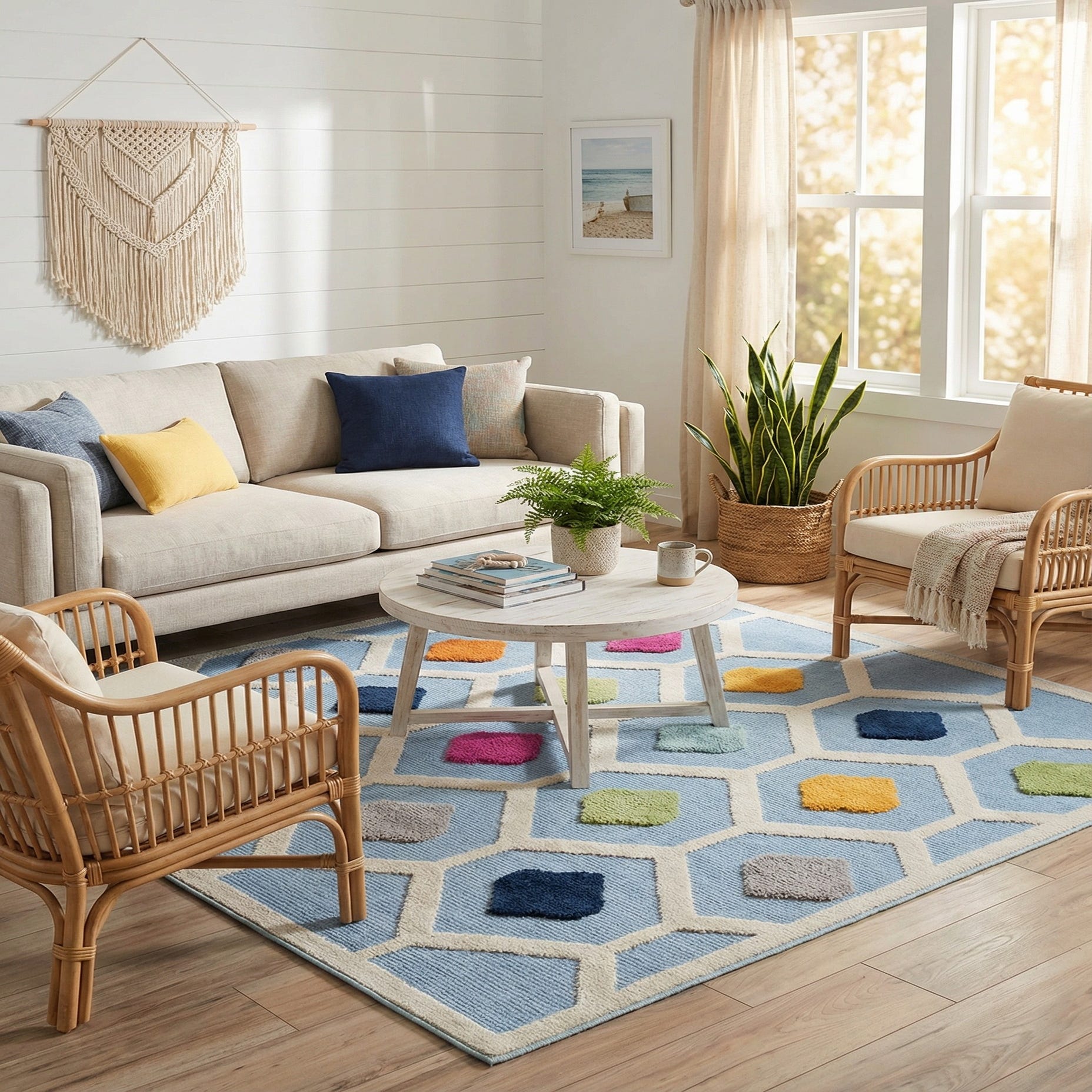 This versatile piece can seamlessly integrate into various decor schemes. Its colorful design would complement contemporary patios, add a playful touch to modern balconies, or serve as a focal point in minimalist indoor living spaces that benefit from a pop of color. The rug's durability and design make it suitable for family rooms, children's play areas, or casual dining spaces where practicality and style are key considerations.