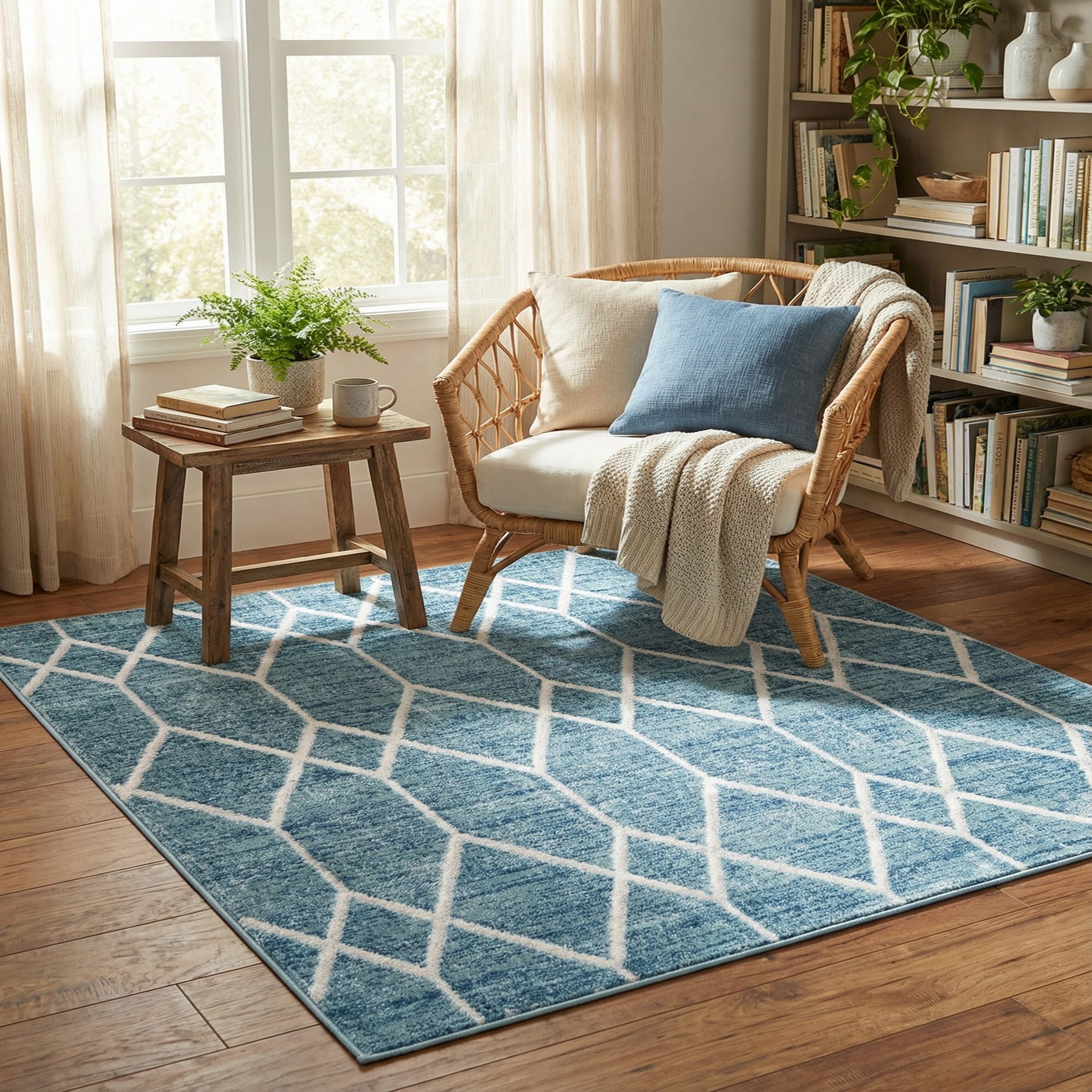 A crisp geometric trellis pattern in ivory crosses a blue field, forming elongated diamonds that give the rug a clean, modern personality. The blue background carries subtle light blue and gray striations that add visual depth, while the slightly raised ivory lines create a gentle texture contrast you can feel underfoot. Machine made from 100% polyester, the pile has a soft hand and a low-profile finish that maintains the pattern’s clarity.