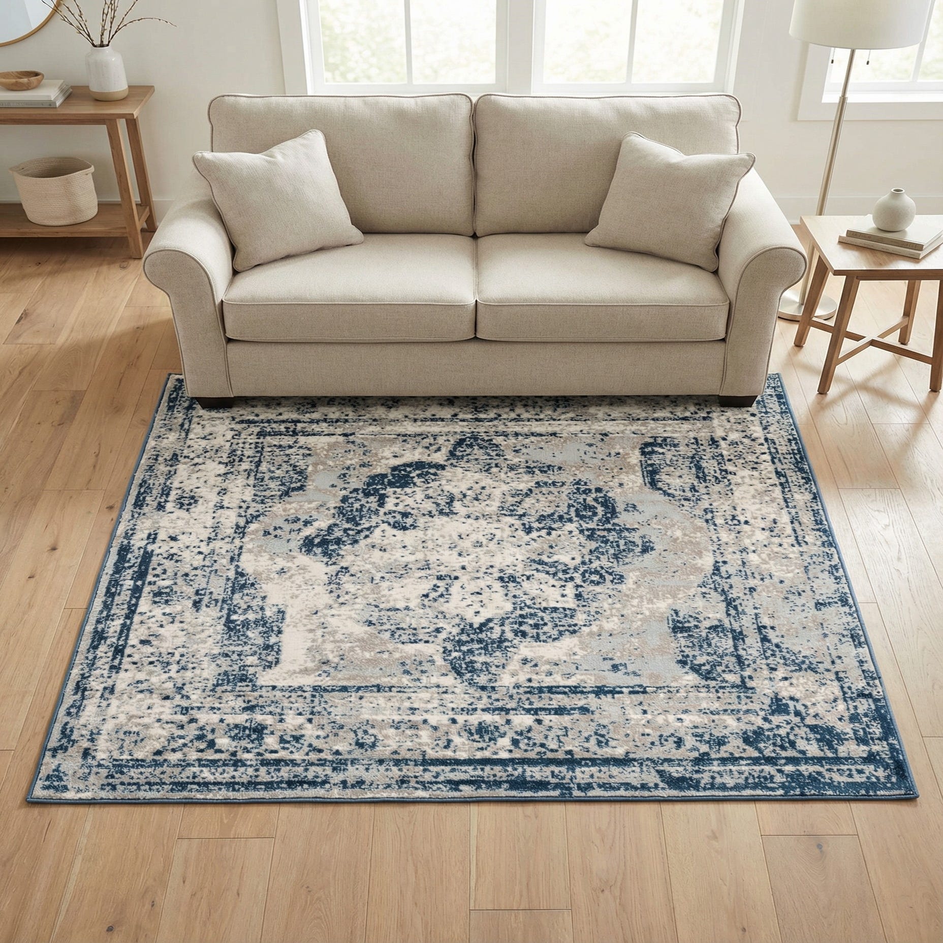 The Monte Carlo collection presents a machine-woven rug constructed from 100% polypropylene, ensuring durability and a soft, inviting texture that complements a variety of flooring. This 5-foot square area rug features a dominant blue background, seamlessly blending with beige, ivory, and light blue hues to create a harmonious pattern reminiscent of distressed, vintage textiles. The nuanced color palette and abstract design offer versatility, allowing for an easy integration within modern, transitional, or coastal decor schemes.