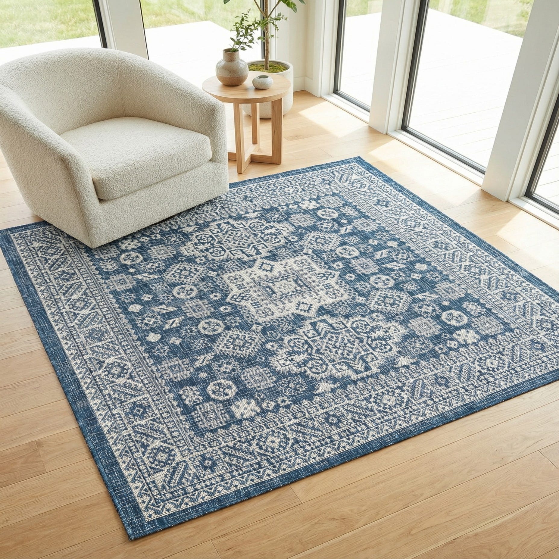 A rich blue field provides the backdrop for an intricate ivory geometric pattern that draws on classic Aztec motifs. A square medallion anchors the center while a series of smaller diamonds, crosses and stepped shapes fill the interior and transition into a layered border. Machine made of 100% polypropylene, the rug has a low-profile, tightly woven surface that feels firm yet approachable underfoot and keeps the pattern looking crisp with a subtle, tactile grain from the weave.
