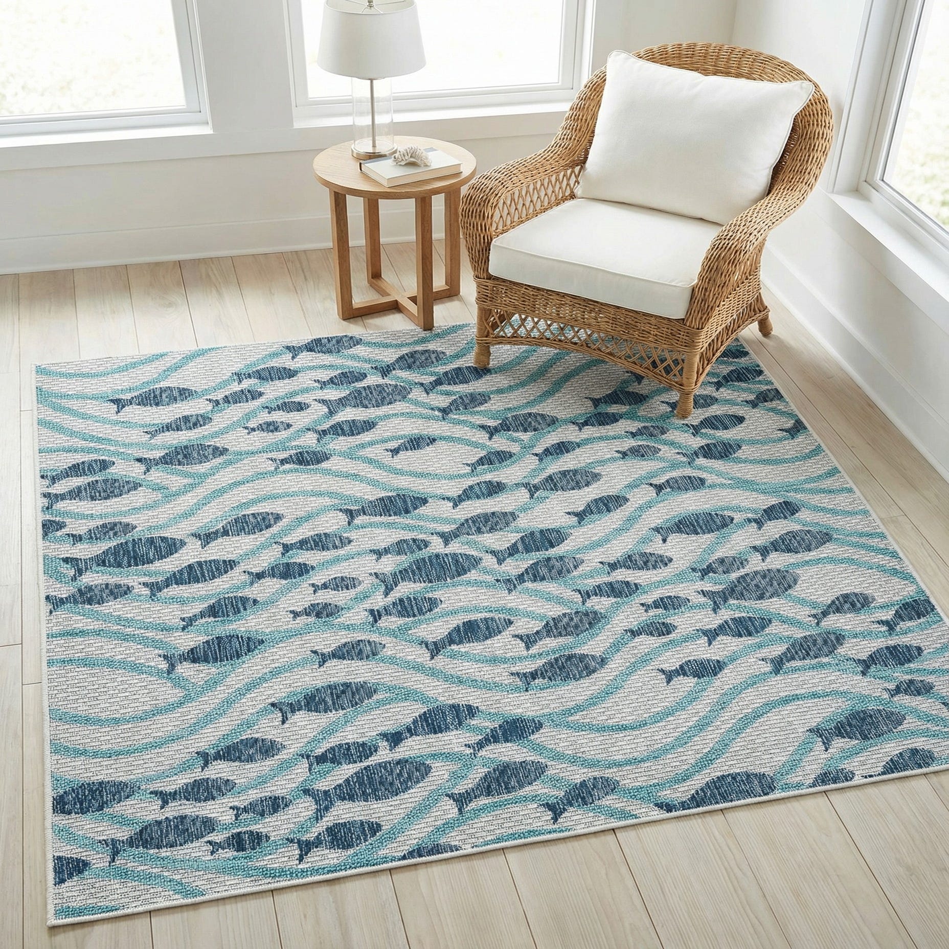 A playful school-of-fish motif swims across a blue ground, the composition defined by undulating light-blue bands and crisp ivory accents. The fish are rendered in layered tones that create subtle striation and movement, while the overall pattern keeps a relaxed, coastal sensibility. Machine-made from 100% polypropylene, the rug offers a low-profile, tightly woven texture that feels slightly crisp underfoot and lays flat for a clean, tailored look.