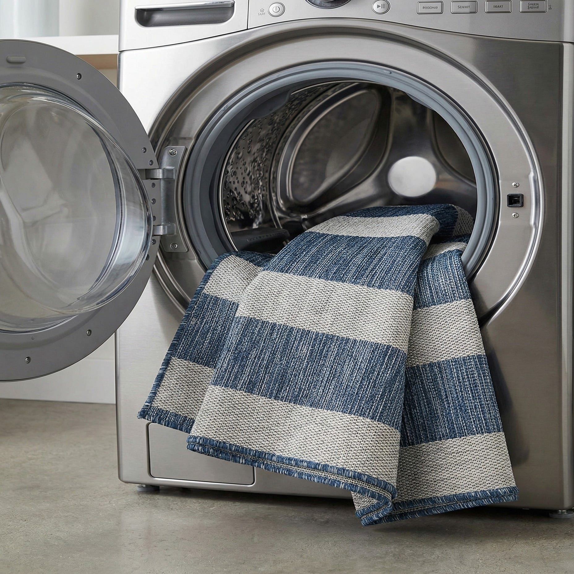 This piece works well on a covered patio, screened porch, or sunroom where its blue, ivory and gray palette complements wicker, painted wood, and metal-framed seating. Indoors, it will ground a casual dining area, mudroom, or coastal living space and pairs easily with navy and white textiles, driftwood finishes, or contemporary minimalist furniture. The clean striping provides a strong graphic element that layers nicely with solid cushions or patterned pillows for a lived-in, pulled-together look.