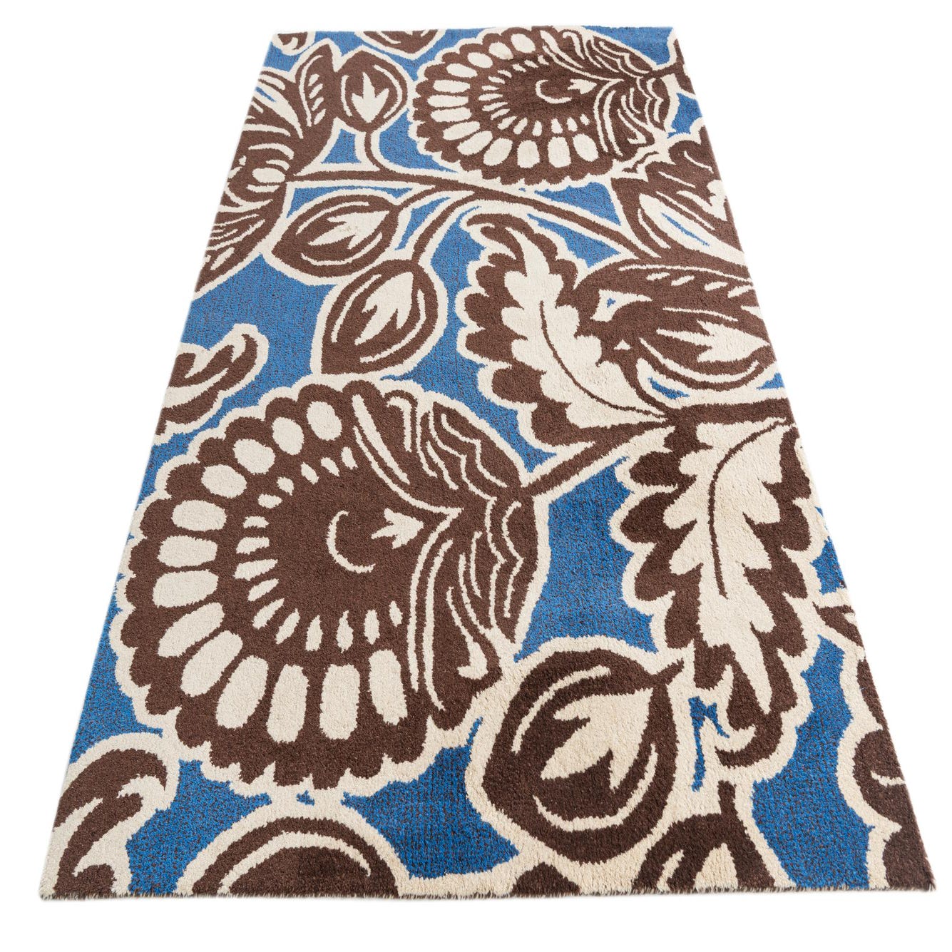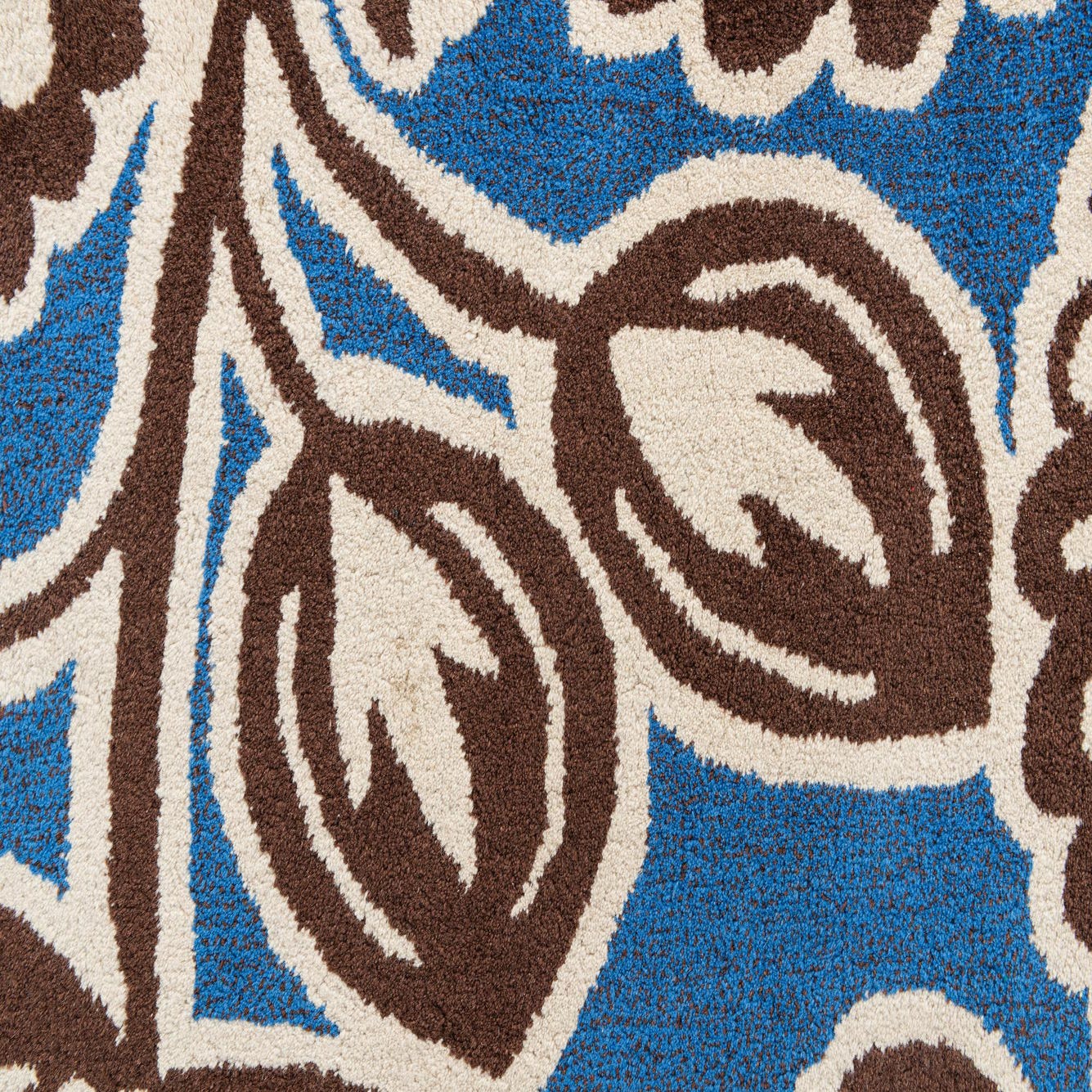 Primary color is Blue. Colors in this rug include: Blue, Brown, Ivory.