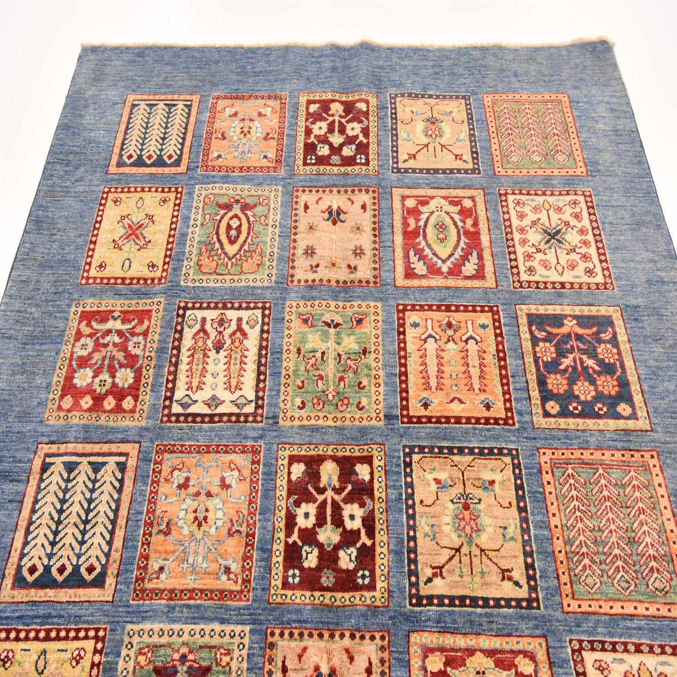 Hand knotted from 100% hand-spun wool, this rug has a softly textured, slightly nubby pile that feels warm and comfortable underfoot. A grid of small square medallions sits on a blue field, each tile bearing its own floral or geometric motif worked in cream, green, navy blue, olive, salmon, maroon, red and tan. Narrow dotted borders around the squares give the design a structured, rhythmic layout while the rich mix of colors adds layered visual depth against the blue background.