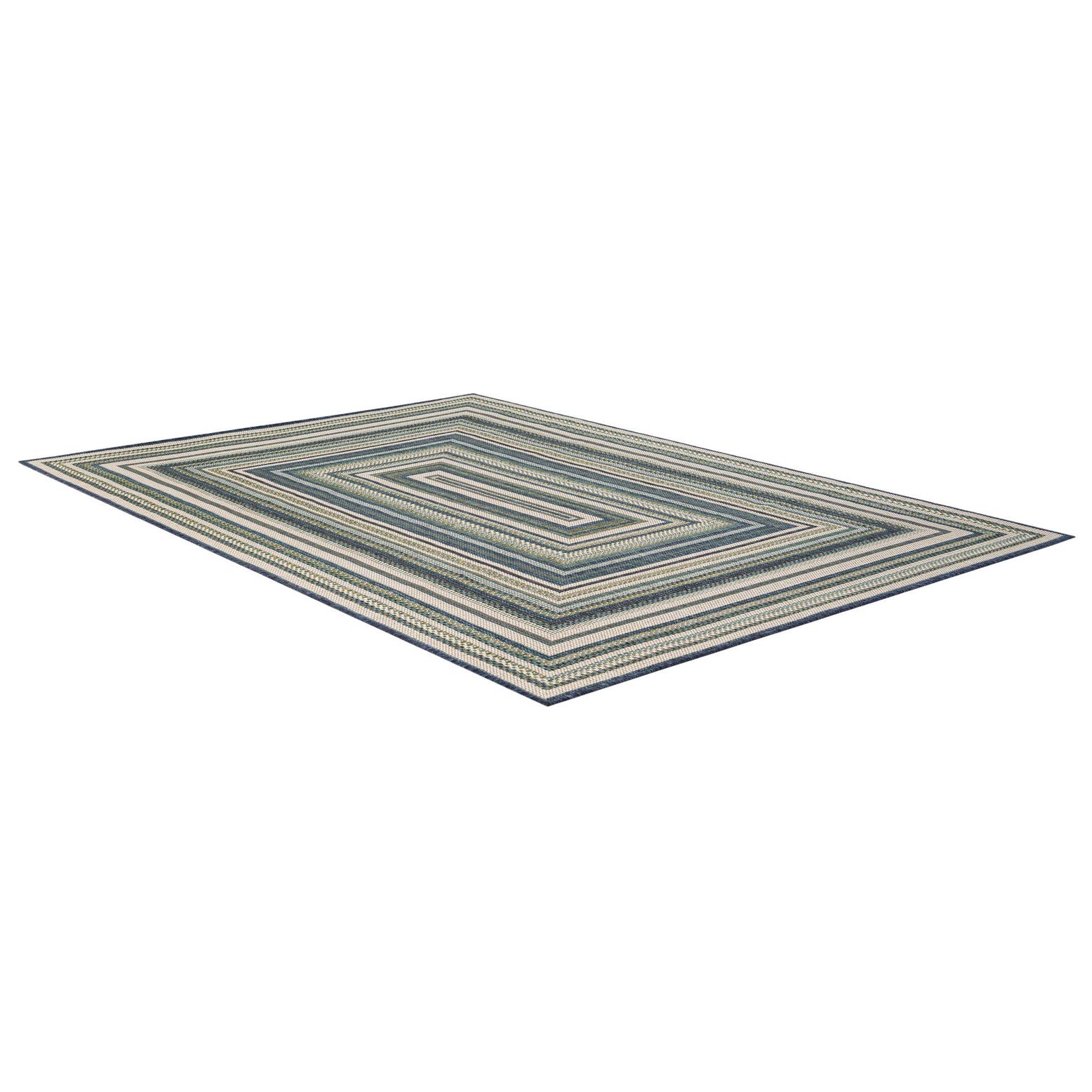 A crisp, geometric stepped-rectangle motif sits on a blue background, formed by tightly spaced bands of navy blue, olive, green and ivory. The repeating stripes create a structured, layered effect that reads both modern and casual; the pattern is precise and balanced rather than ornate. Machine made of 100% polypropylene, the rug has a low-profile, tightly woven, flatweave-like surface you can feel underfoot—firm with a subtle texture that catches light and color for visual depth.