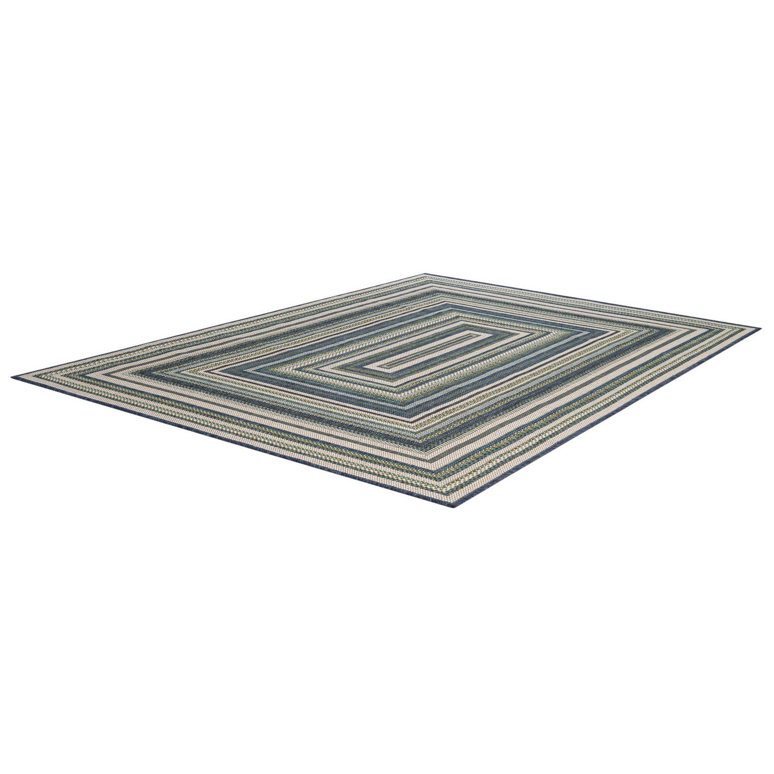 Place this rug on a covered patio, sunroom, or a high-traffic living area where its directional stripes can define a seating group or anchor a dining set. It pairs naturally with warm wood furniture, navy linens or cushions, and woven rattan for a relaxed coastal or transitional aesthetic; add olive-toned accents and plenty of greenery to amplify the rug’s green and blue palette.