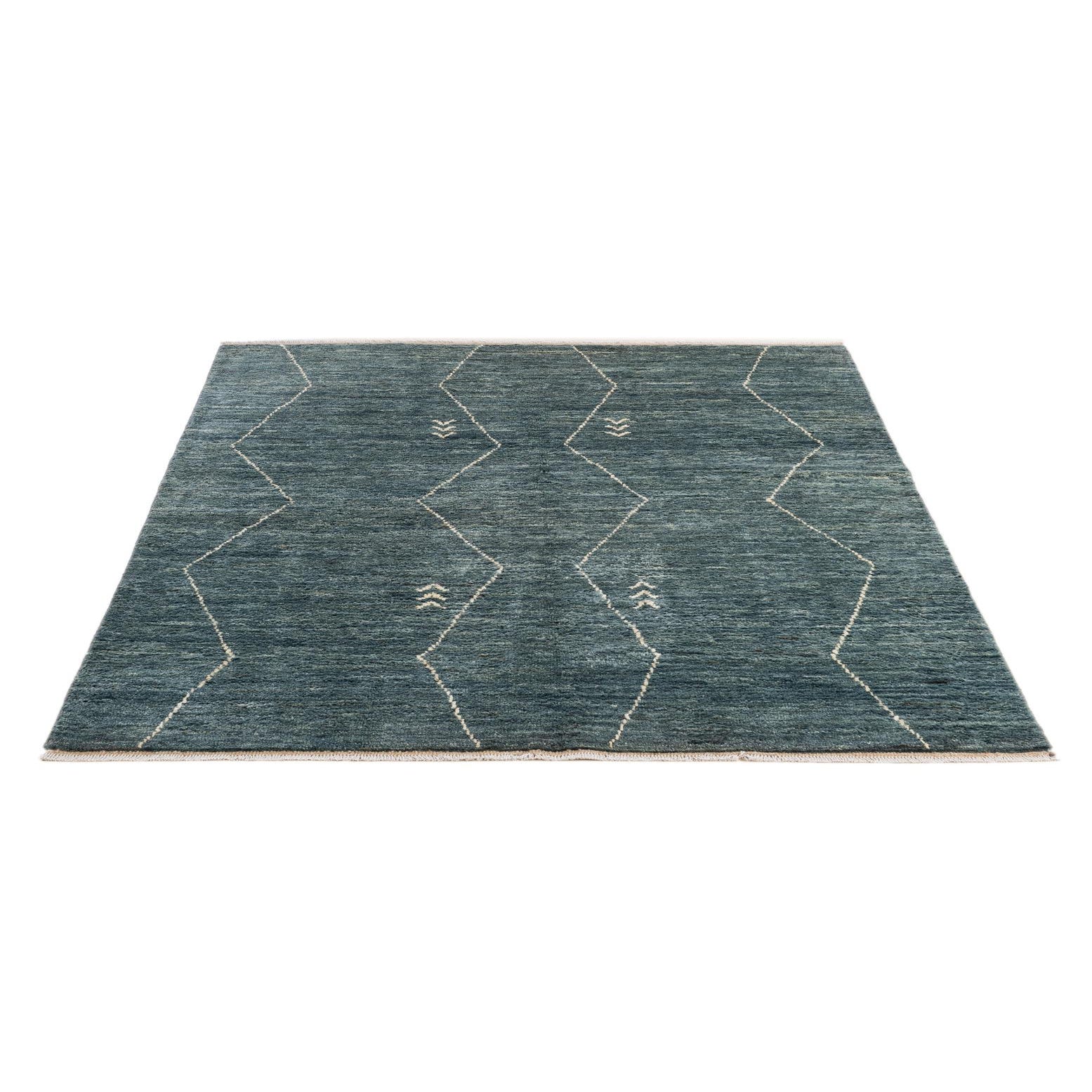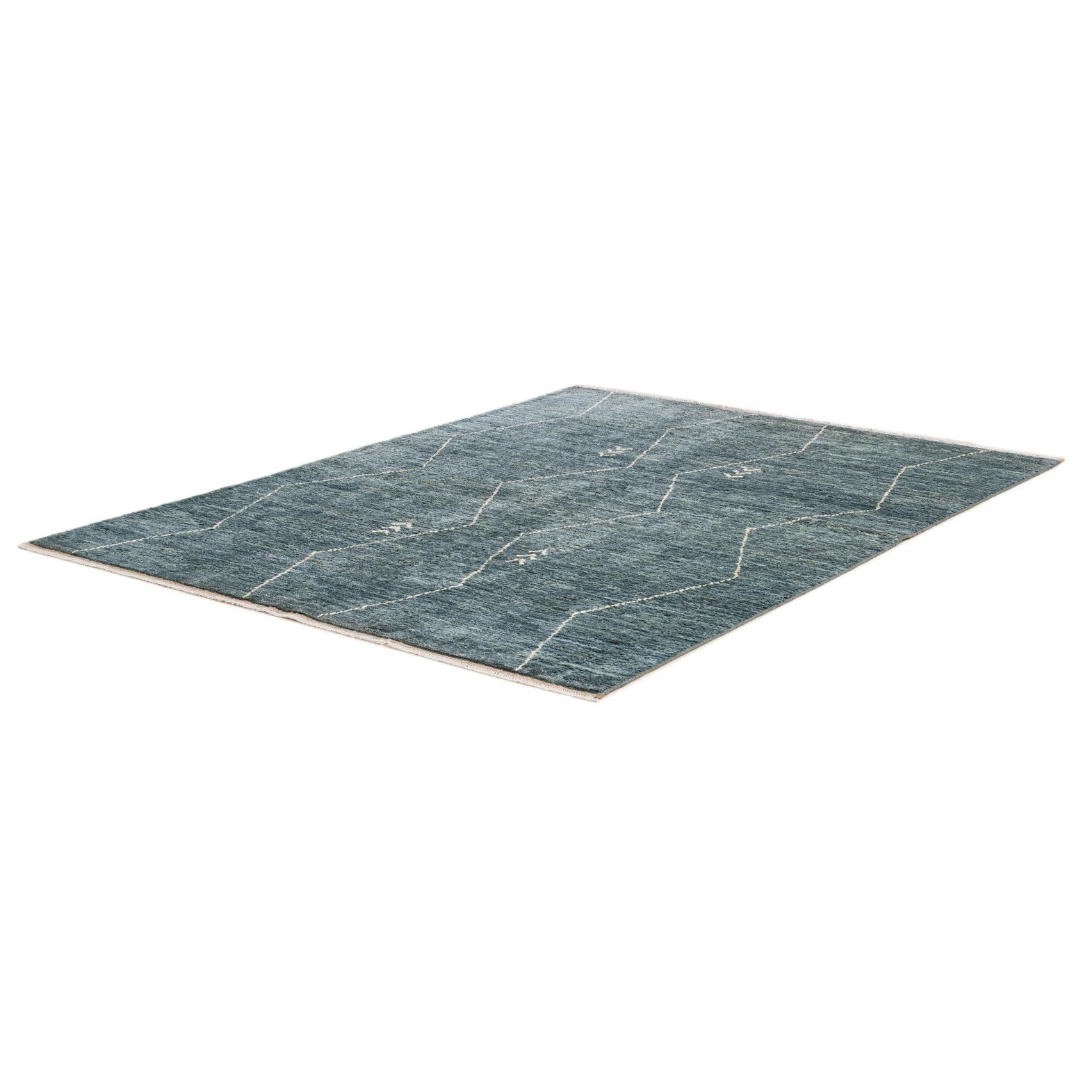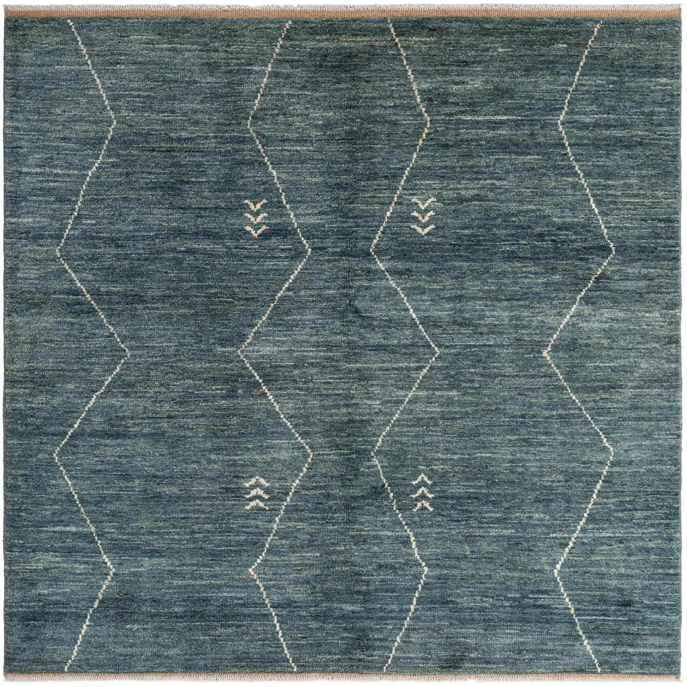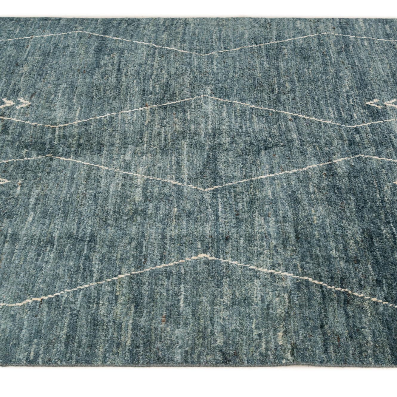 A 5x7 rectangular blue wool rug with a modern geometric diamond pattern and small arrow motifs, suitable for an indoor living space.