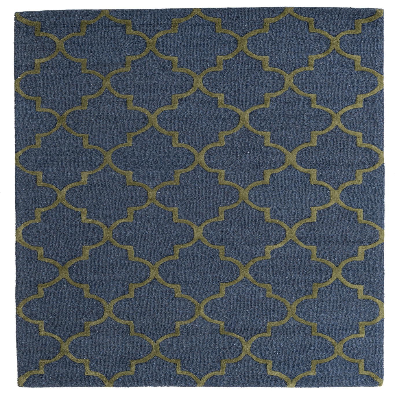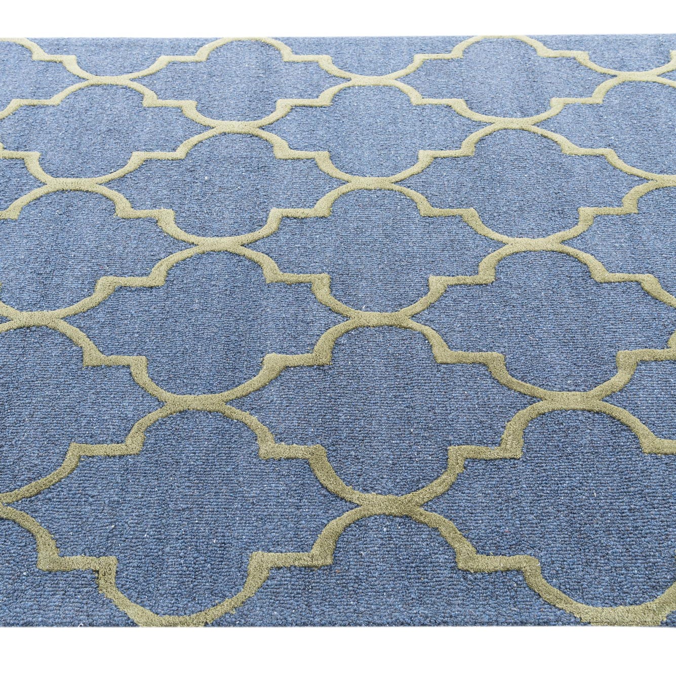 A 5x7 rectangular blue wool and cotton rug with a high pile, featuring an olive green modern abstract quatrefoil pattern.