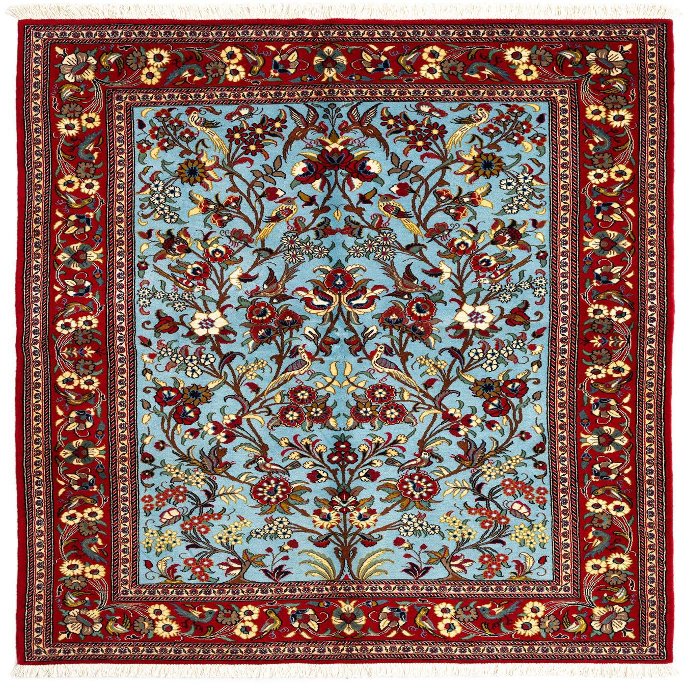 A 5x7 rectangular handmade wool rug featuring a light blue field with an intricate floral and bird pattern, framed by a rich red border with complementary motifs.