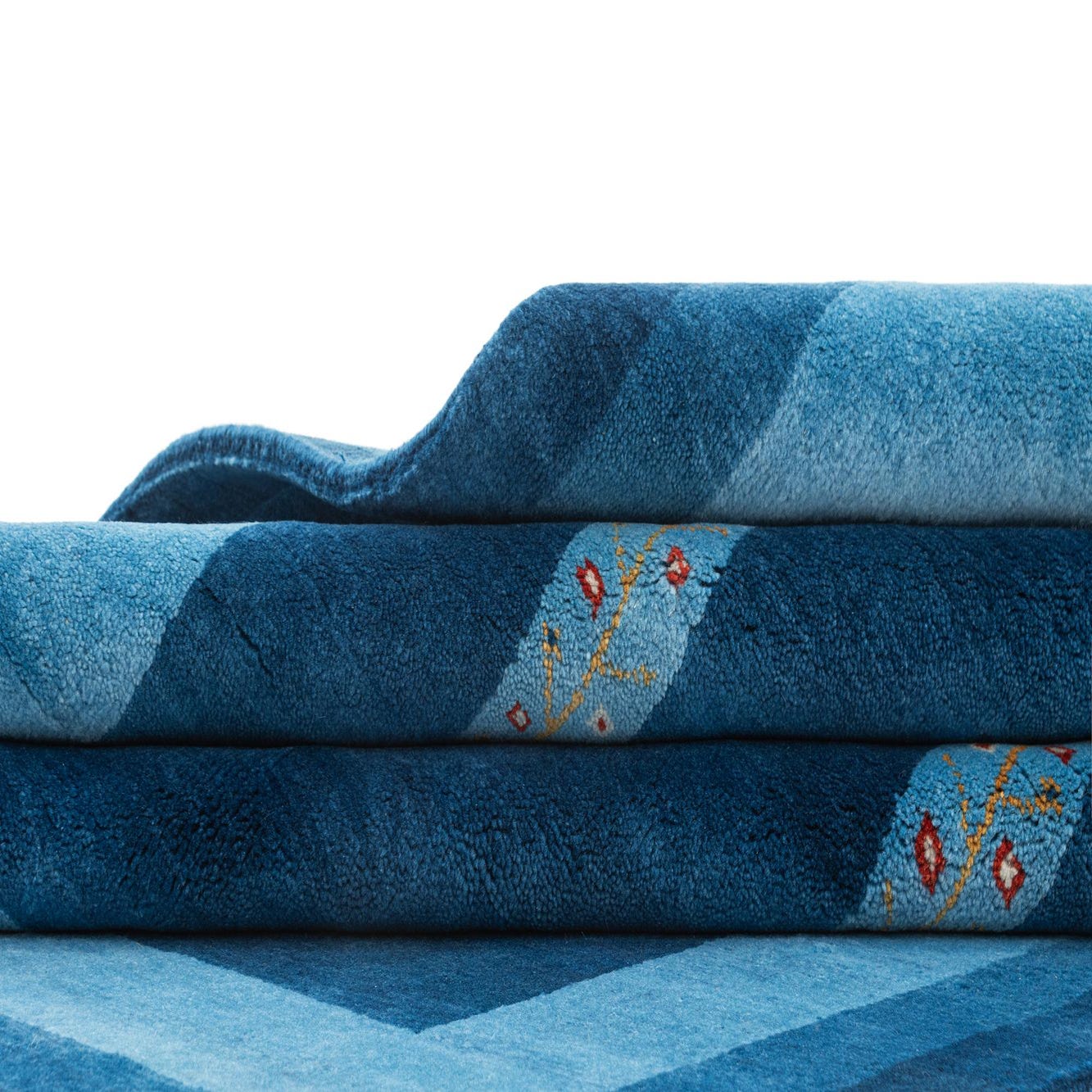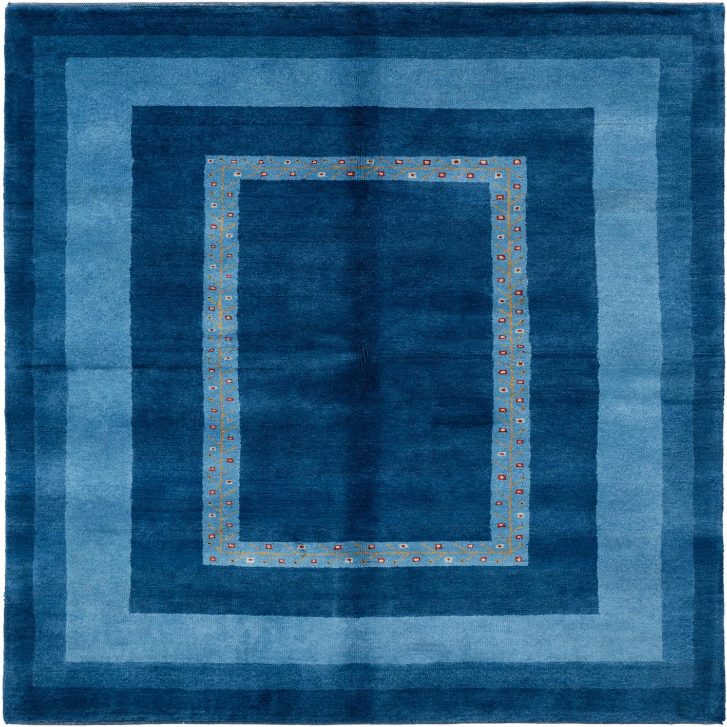 A 5x7 rectangular Rugs.com Tibet rug in varying shades of blue, featuring a modern border with subtle oriental accents.