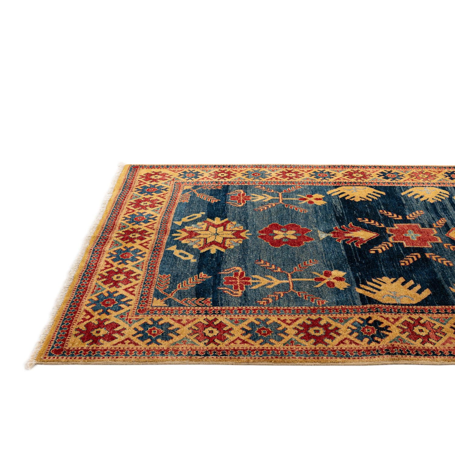 Primary color is Blue. Colors in this rug include: Blue, Cream, Red, Yellow.