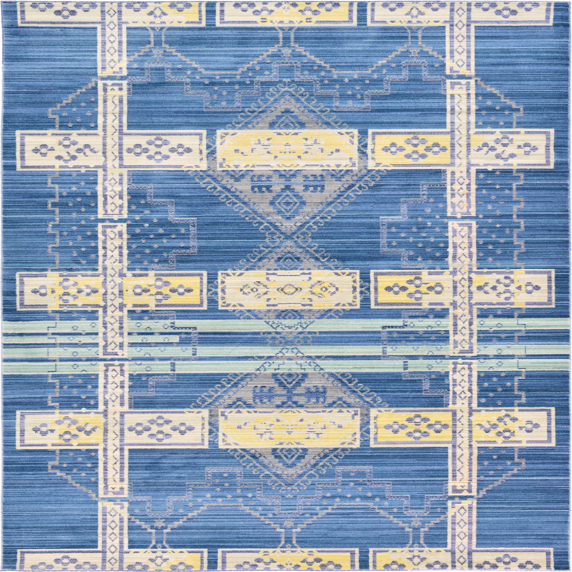 Primary color is Blue. Colors in this rug include: Blue, Light Blue, Yellow, Ivory.