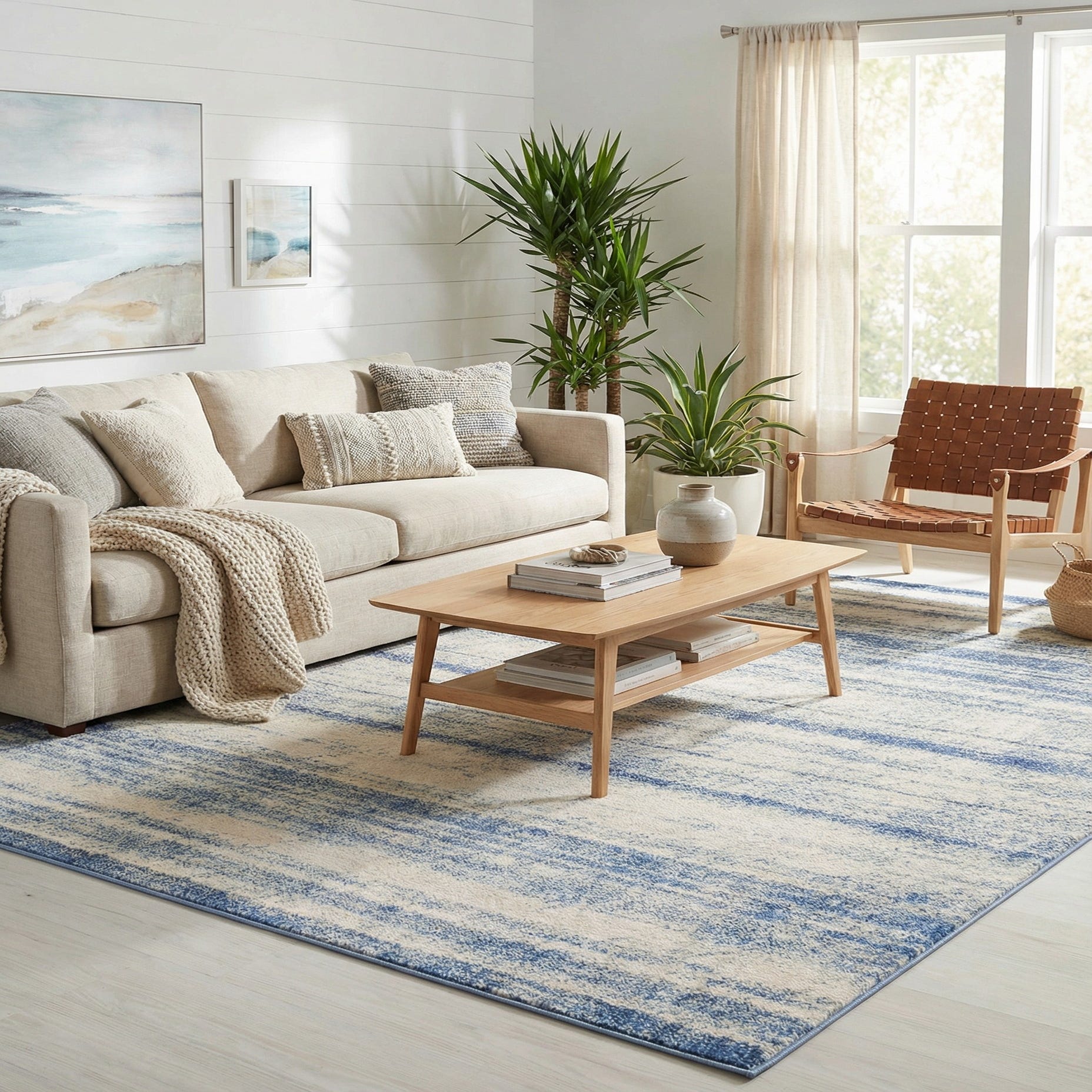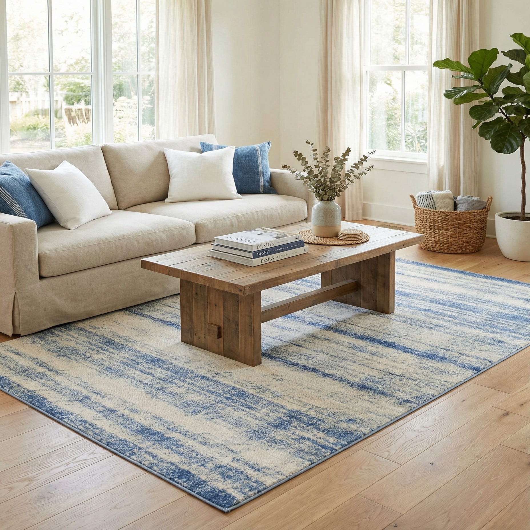 This rug works well in relaxed living rooms, coastal-inspired bedrooms, or transitional spaces that blend modern and classic elements. Pair it with light-wood furniture and linen upholstery for a breezy, layered look, or anchor a seating area with navy accents and textured throws to deepen the palette. It also sits nicely under a coffee table or desk, softening hard flooring while adding a calm, lived-in visual interest.