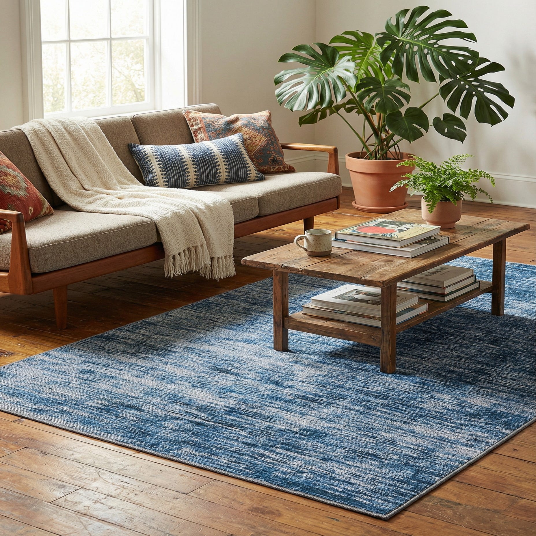A 5x8 rectangular blue modern area rug with a textured stripe pattern, ideal for a living room or office.