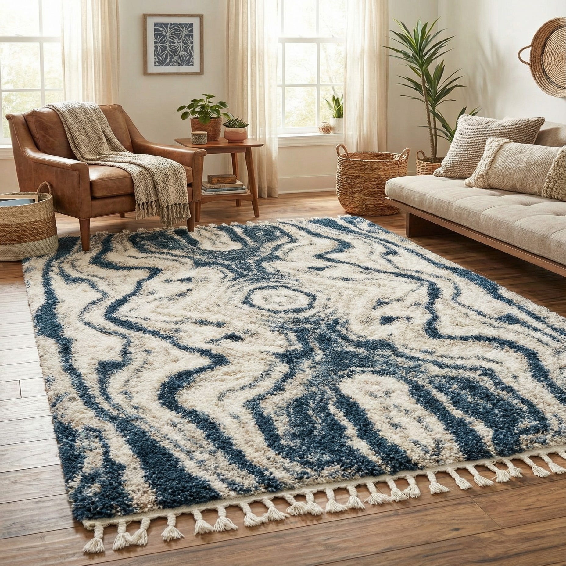 This rug works well in living rooms and bedrooms where a cozy textured layer is needed—place it under a sofa and coffee table, at the foot of the bed, or in a reading nook to soften hard floors. It pairs naturally with light wood or painted furniture, linen upholstery, and navy or neutral accents for a modern coastal or transitional look; it also complements eclectic and bohemian schemes when layered with natural-fiber rugs and mixed textiles.