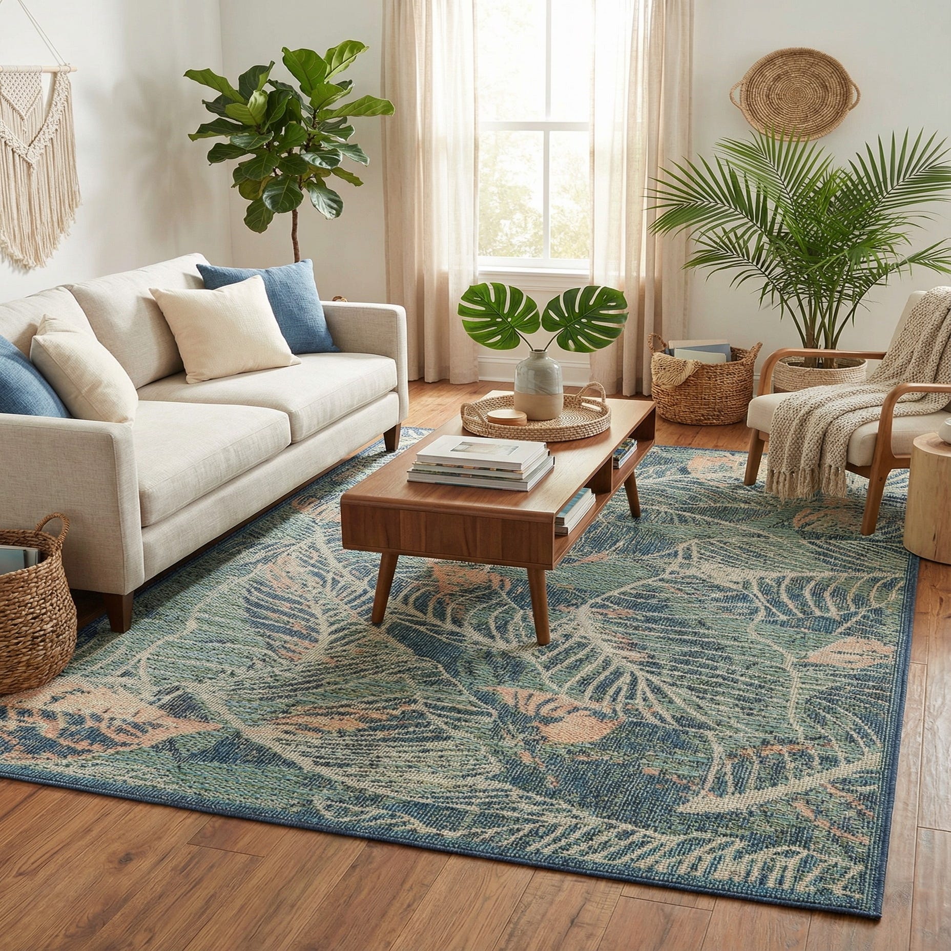 This rug fits naturally on a covered patio, screened porch or poolside seating area, and also translates well to casual indoor spots like a sunroom, mudroom or kitchen dining nook. Pair it with rattan or teak furniture and navy or ivory cushions for a coastal look, or layer it under a simple metal bistro set to anchor an alfresco dining area. The color mix complements both warm, weathered woods and cool painted finishes, making it an easy choice for transitional and relaxed, nature-inspired interiors.