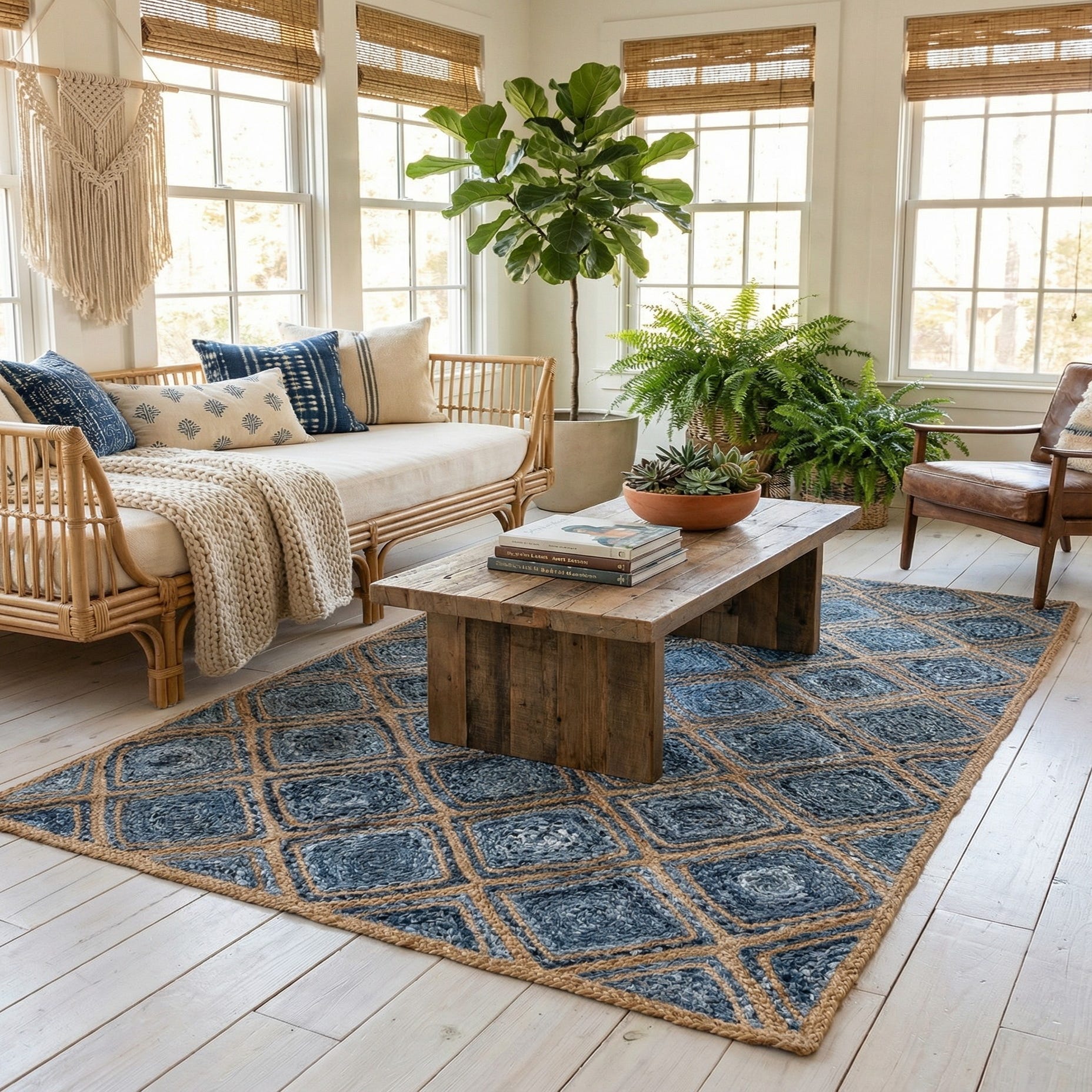 This rug works well in relaxed living rooms, coastal or farmhouse-style dining areas, and sunlit entryways where layered texture and blue tones add visual interest. Place it beneath a neutral linen sofa or natural-wood coffee table to pick up the beige accents, or pair it with navy pillows and woven baskets for a cohesive, pulled-together look. It also layers nicely over hardwood or a larger natural-fiber rug to introduce both color and structure to the room.