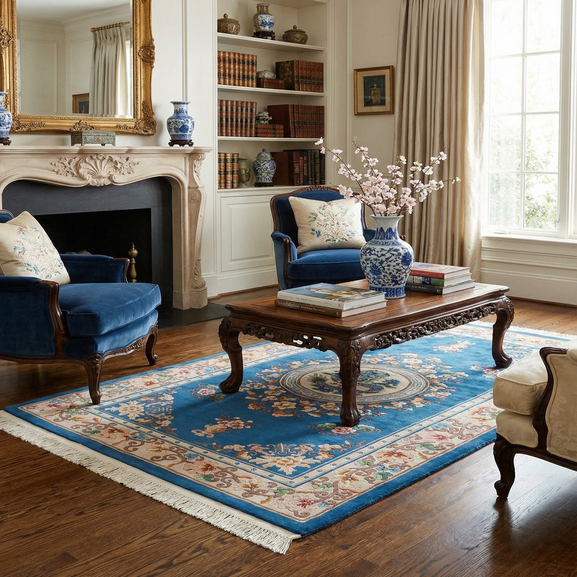 A 5x8 rectangular blue wool rug with a traditional Oriental floral pattern, featuring a central dragon medallion and intricate border.