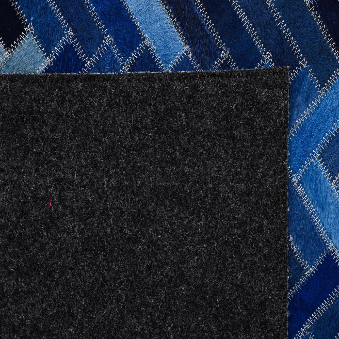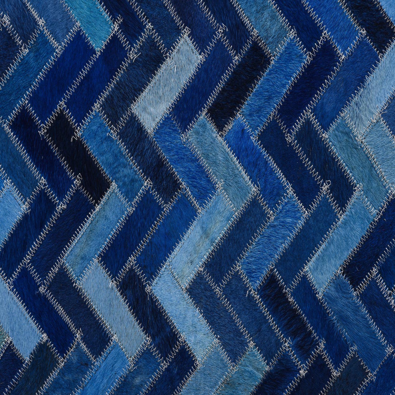 A rich chevron of blues creates a lively, geometric field across this handmade cowhide and leather rug. Parallelogram-shaped patches in navy, deep blue and light blue are stitched together in a tight zigzag that gives the surface graphic movement while the blue background keeps the palette cohesive. Subtle tonal shifts between pieces add depth and keep the pattern from feeling flat.