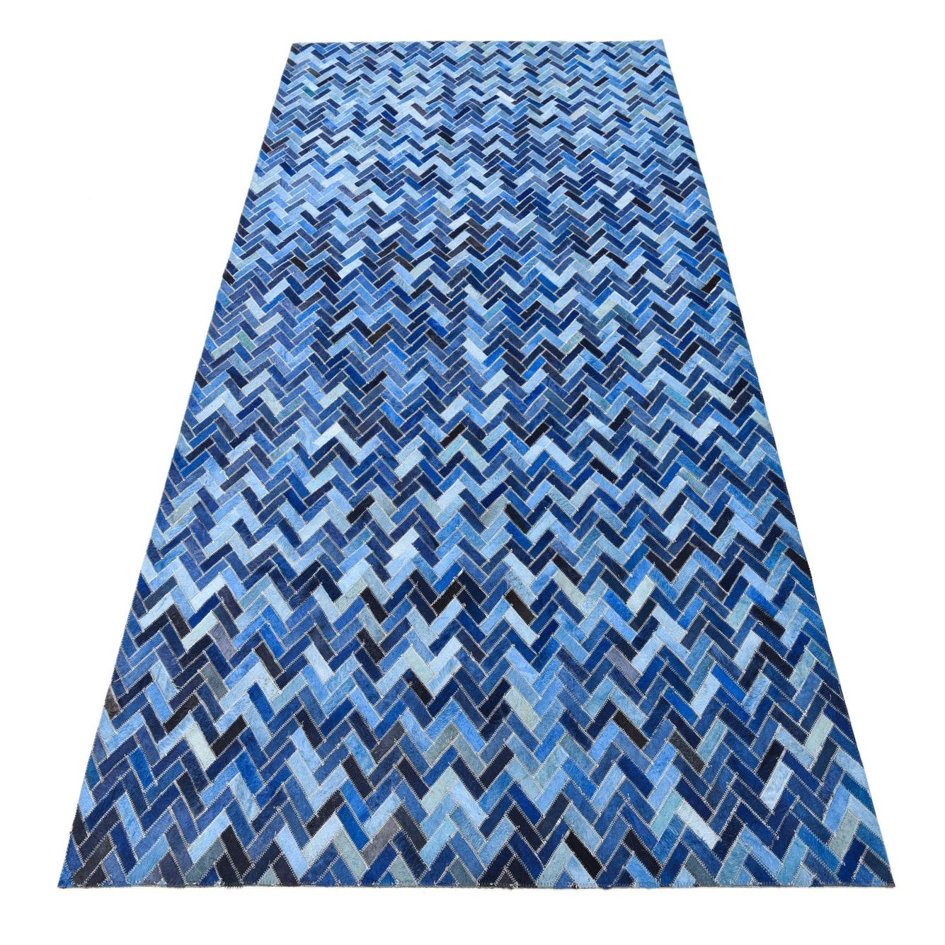 A 5x8 rectangular Cowhide rug featuring a modern herringbone pattern in various shades of blue.