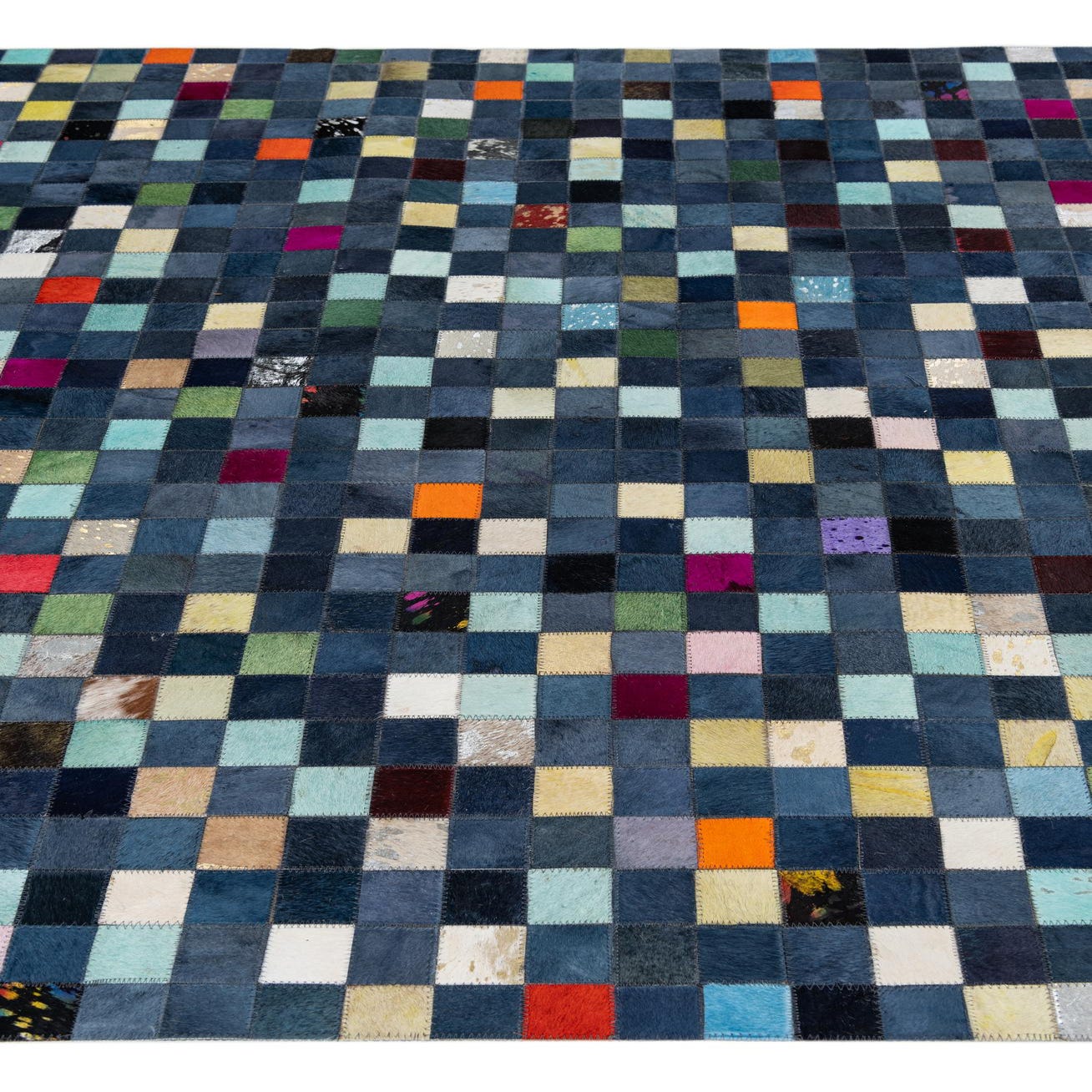 A 5x8 rectangular Cowhide Leather rug featuring a modern, abstract patchwork of various blue, green, orange, pink, and white squares.