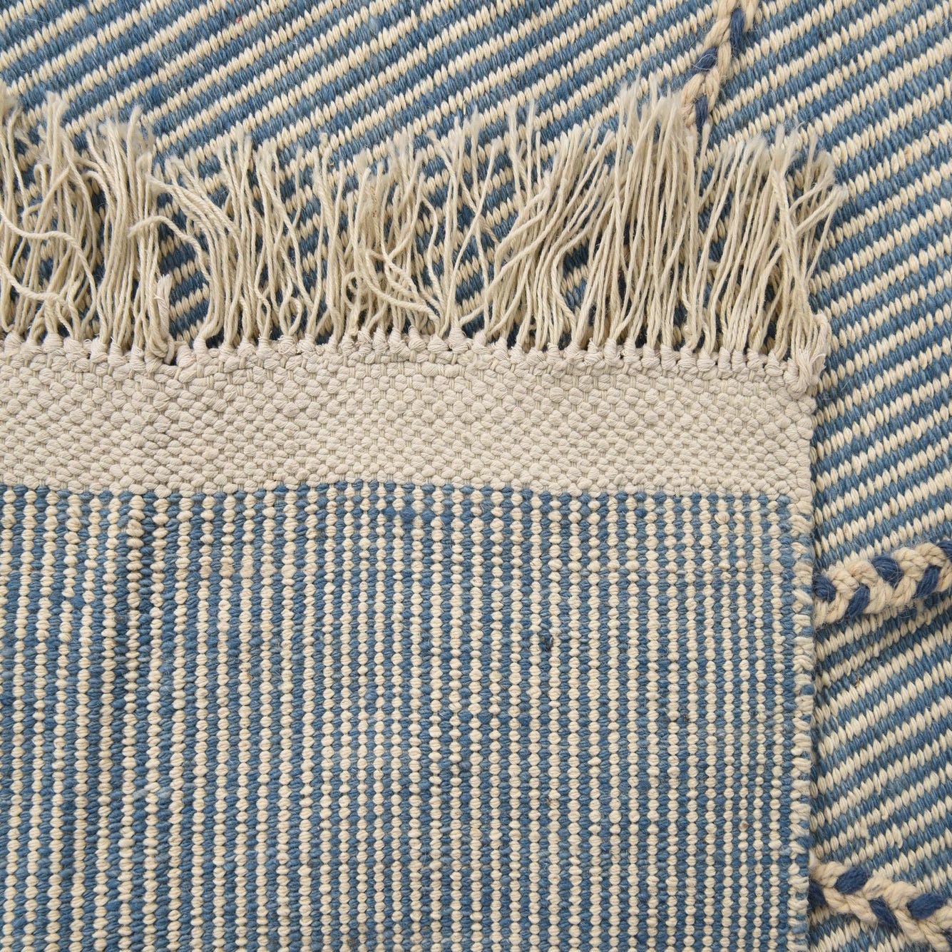 Finished with fringe, the rug imbues a sense of tradition and casual elegance. The blue and ivory colors suggest versatility, making the rug suitable for a range of decor styles, from coastal-inspired rooms that embrace light and airy themes to more classic settings that appreciate timeless design elements. Its size and design would work particularly well in small to mid-sized living areas, under a coffee table or as a standout piece in a serene bedroom setting.