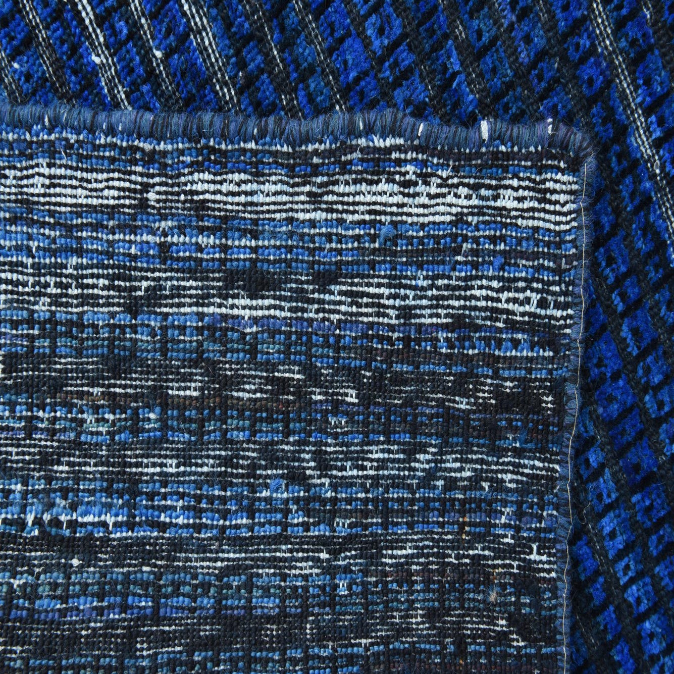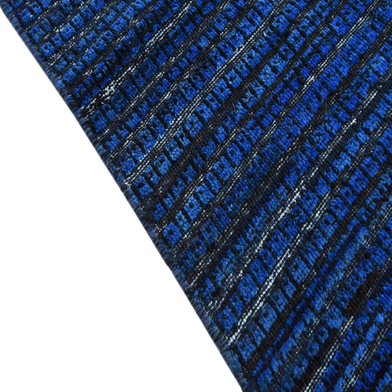 The Darya collection presents a sophisticated 5x8 hand-knotted rug crafted from 100% wool. This piece showcases a deep blue background with subtle incorporations of black and ivory hues that create a dynamic visual texture. The rug's pattern exhibits an understated linear abstraction, providing a contemporary take on classic design elements.