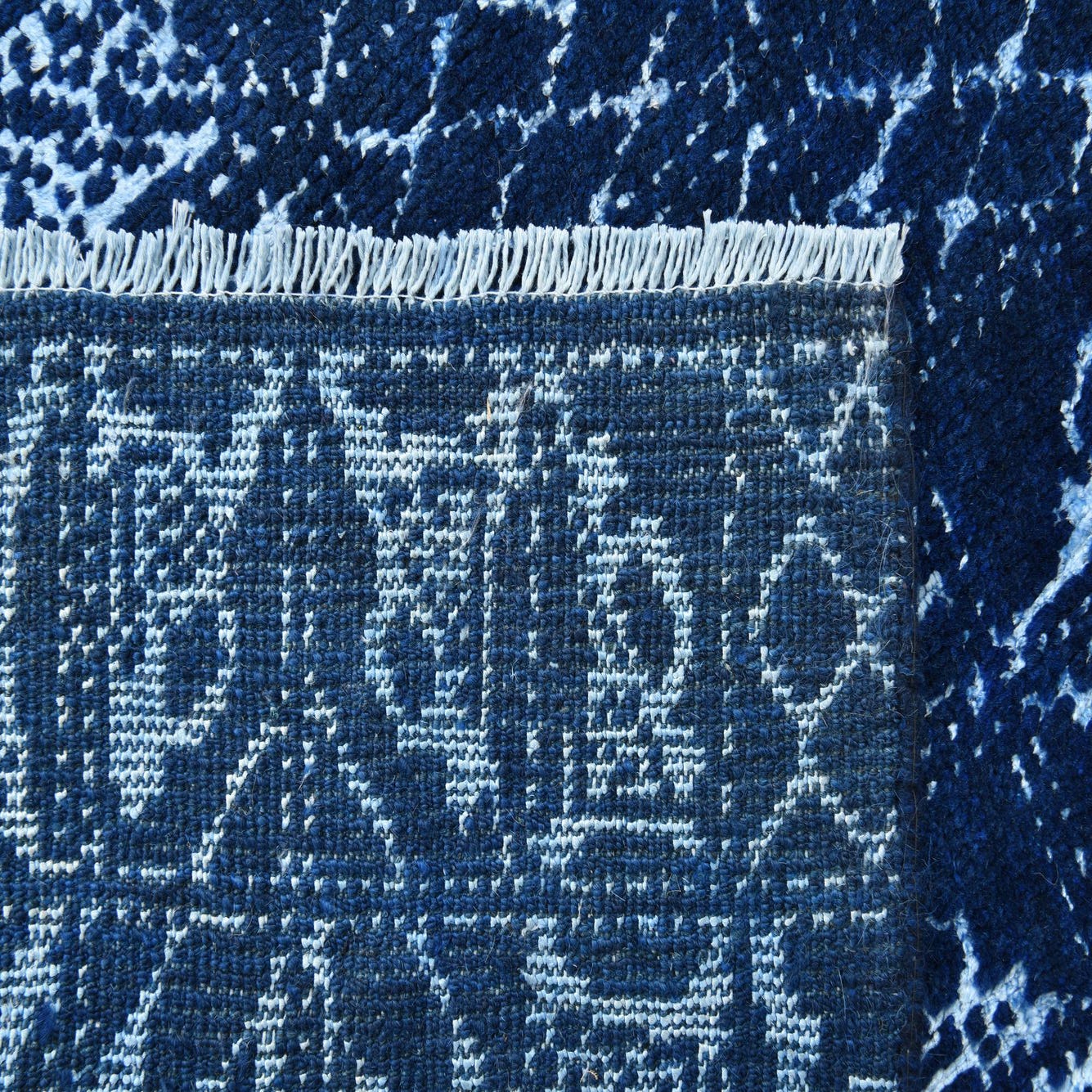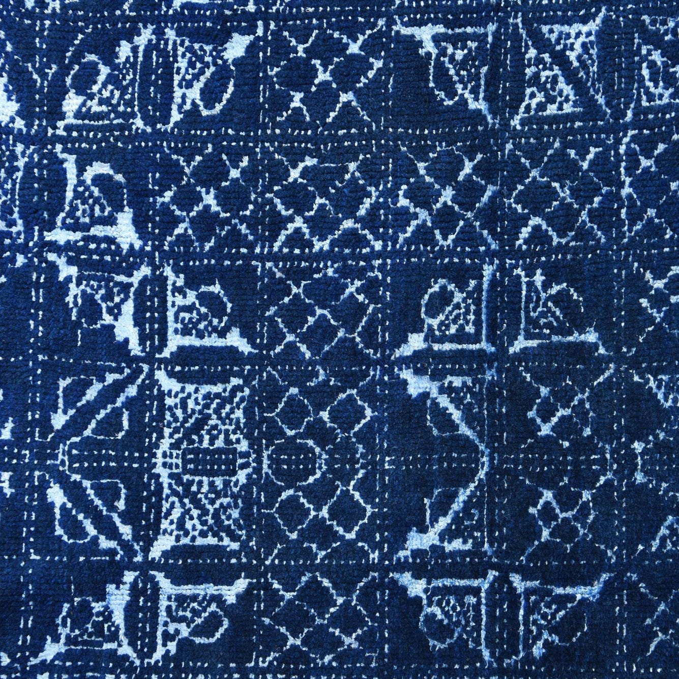 The Darya collection 5x8 rug presents a rich blue background with lighter blue pattern work that creates a compelling visual texture. This hand-knotted piece, constructed from a blend of wool and silk, offers a soft and luxurious feel underfoot. The intricate design features a symmetrical array of geometric and traditional motifs that would serve as a focal point in any space.