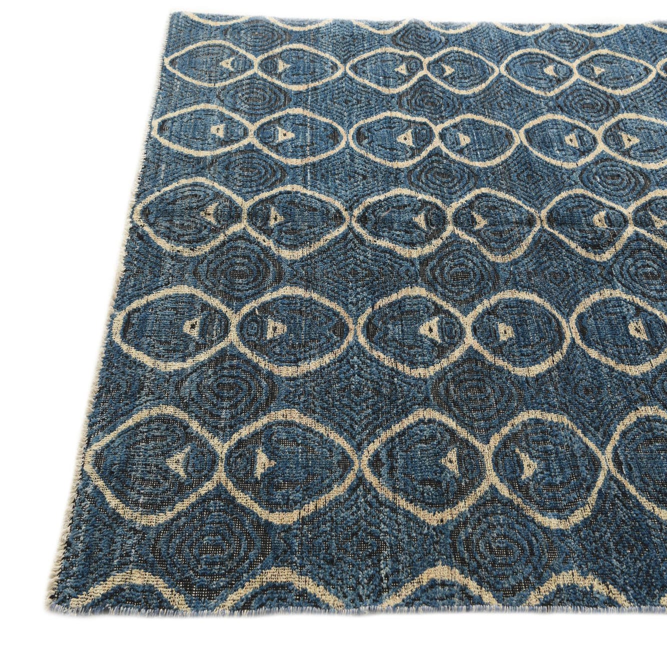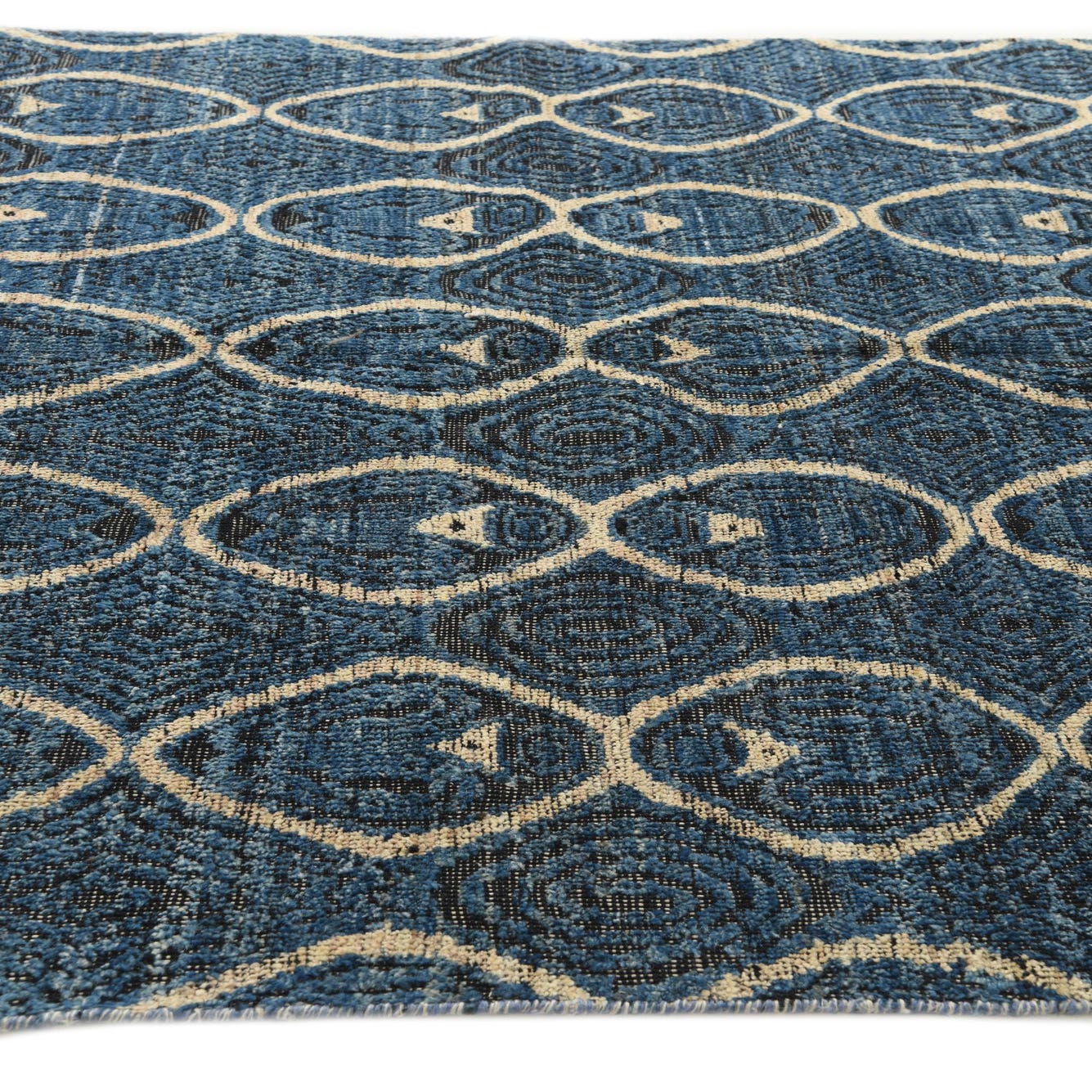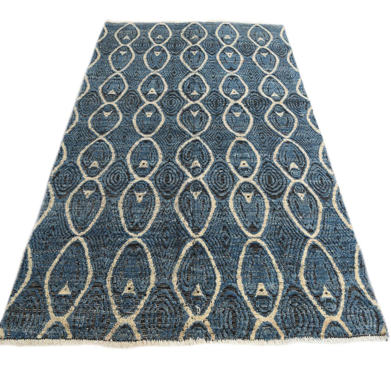 A 5x8 rectangular Darya rug with a high pile, featuring a modern abstract pattern of interlocking cream ovals on a rich blue background.
