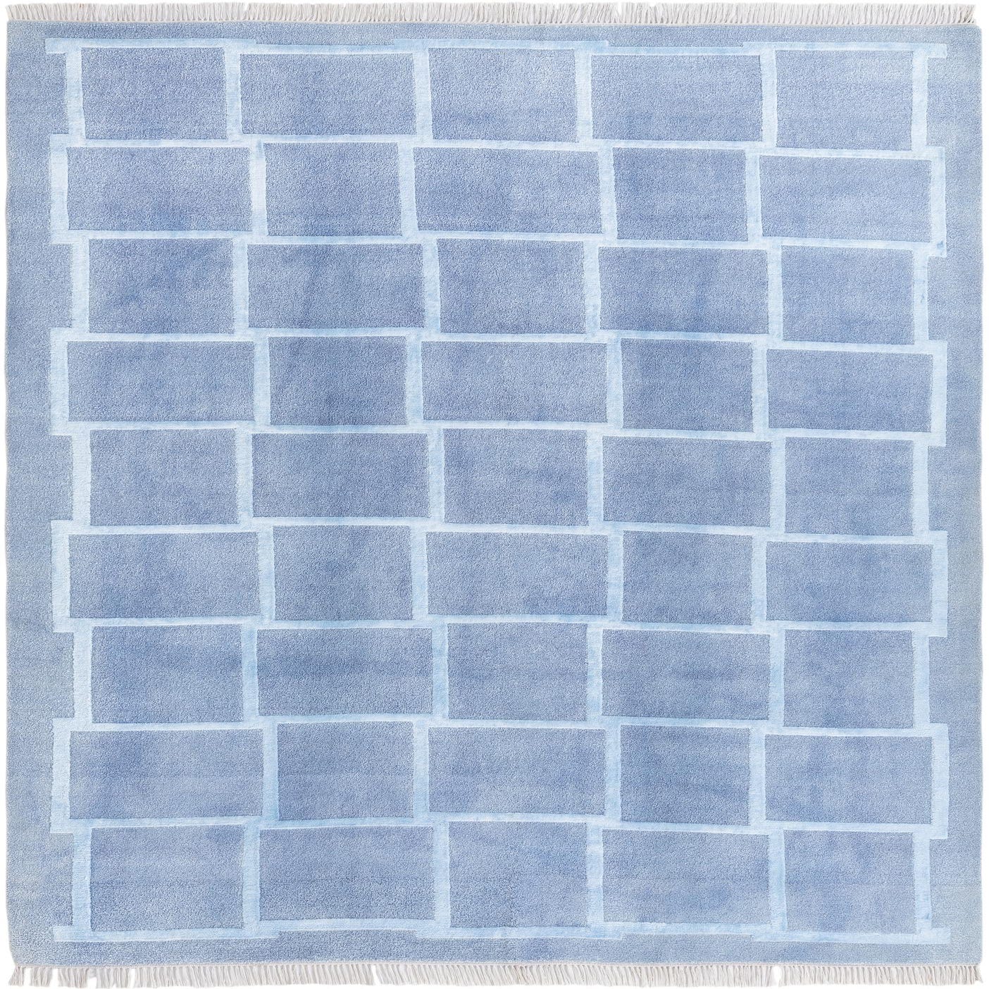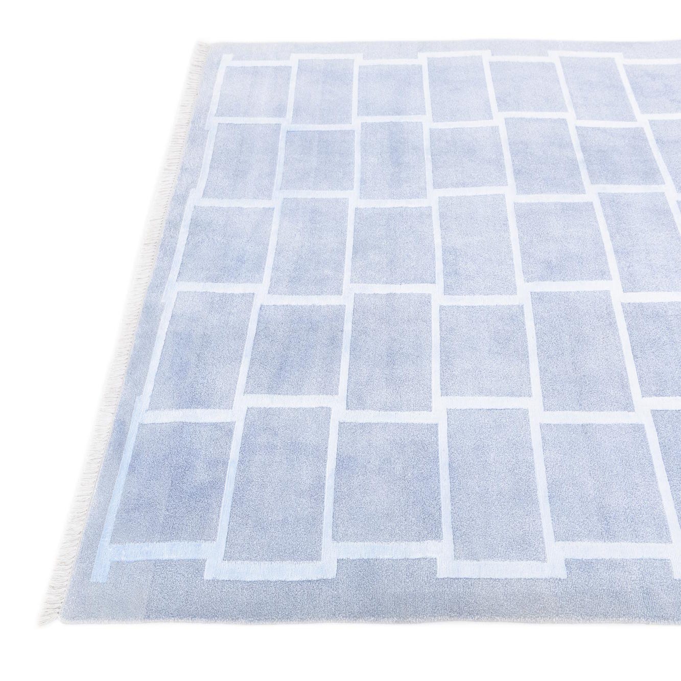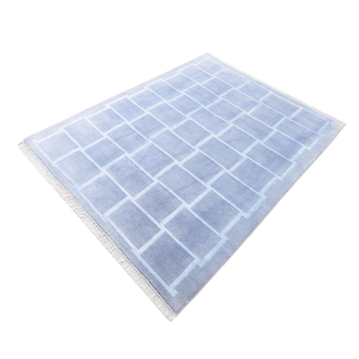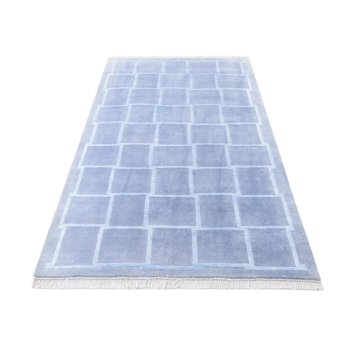 A 5x8 rectangular Darya rug in varying shades of blue, featuring a modern geometric pattern of interlocking rectangles, made from 100% wool with a high pile.