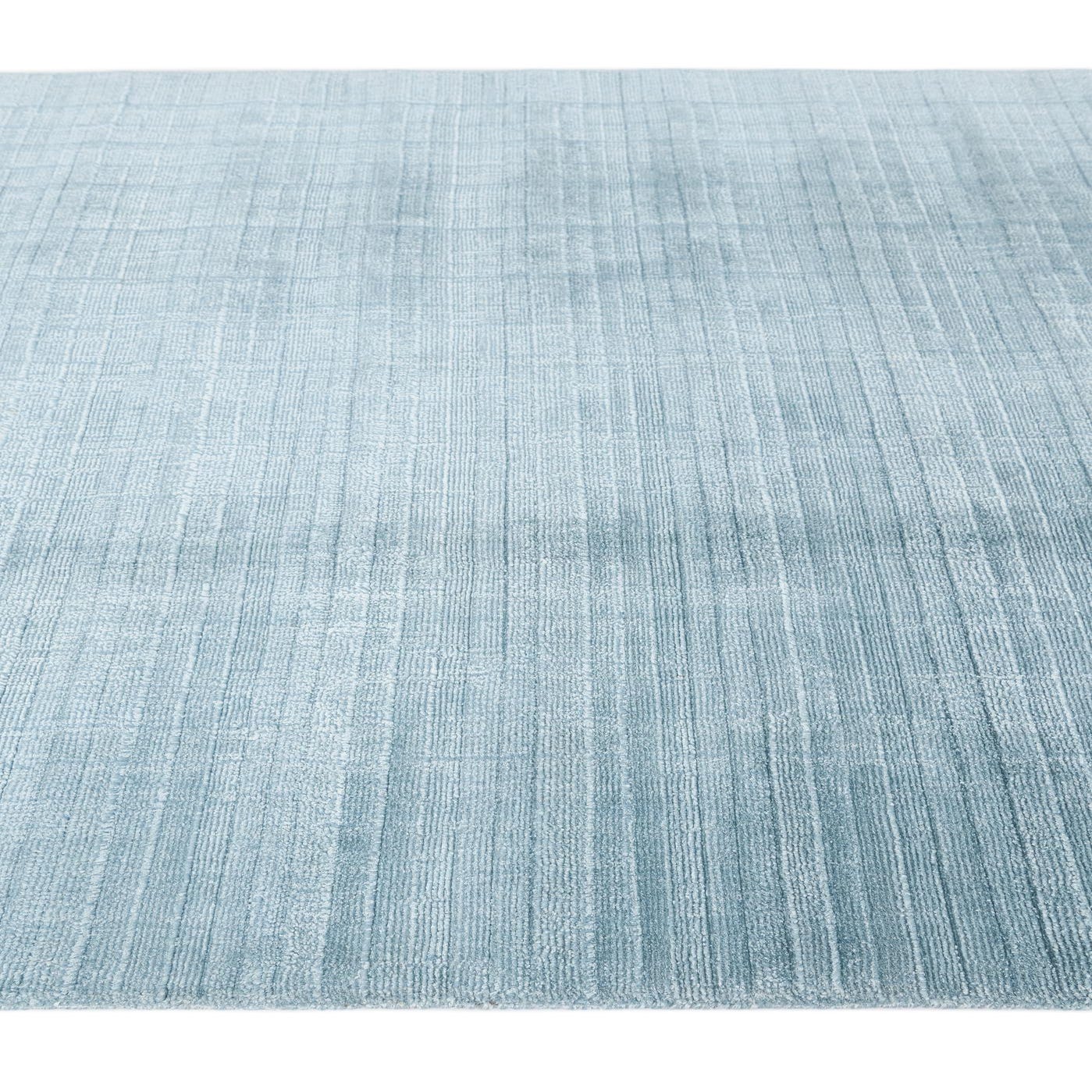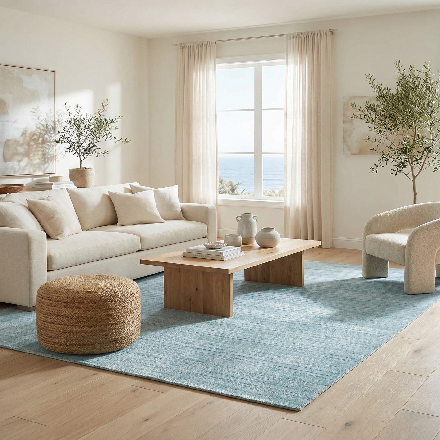 This wool rug's calming color scheme and understated pattern make it a versatile addition to a variety of interior design styles. It would complement a contemporary setting with its minimalistic approach, as well as add a touch of modern elegance to transitional decor. The rug can be seamlessly integrated into a coastal-inspired room, enhancing the airy and light aesthetic with its aquatic hues.