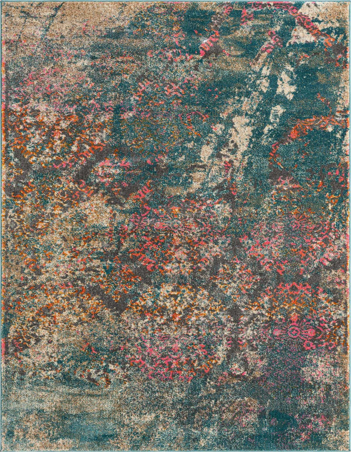 Primary color is Blue. Colors in this rug include: Blue, Beige, Orange, Purple, Pink, Yellow.