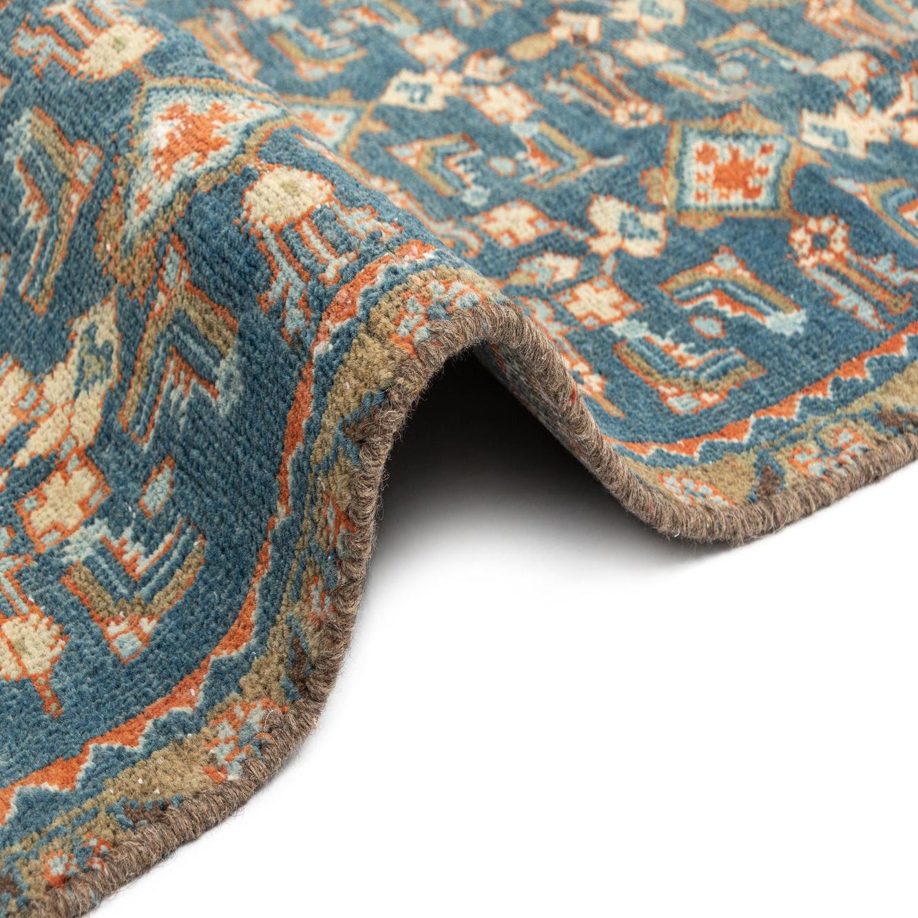 Primary color is Blue. Colors in this rug include: Blue, Blue, Orange, Brown, Cream, Light Blue.