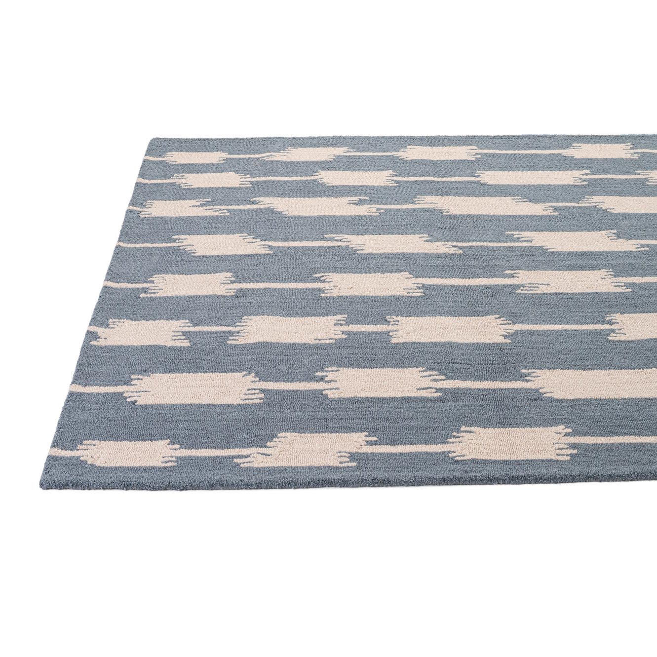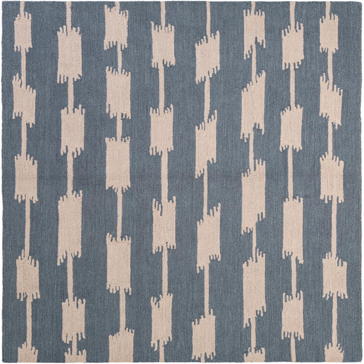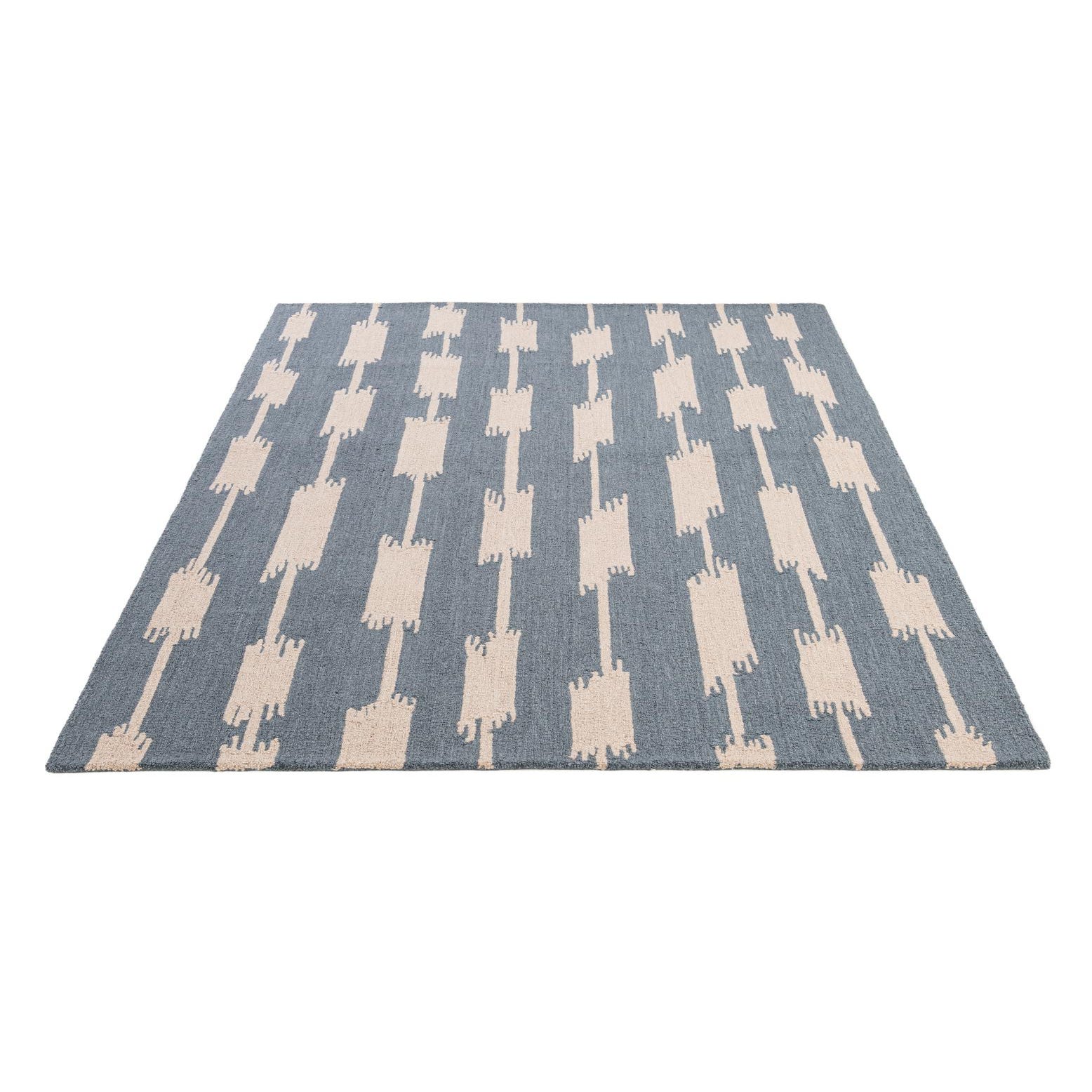 A 5x8 rectangular blue wool rug with a modern abstract pattern of vertical beige chain-link shapes.
