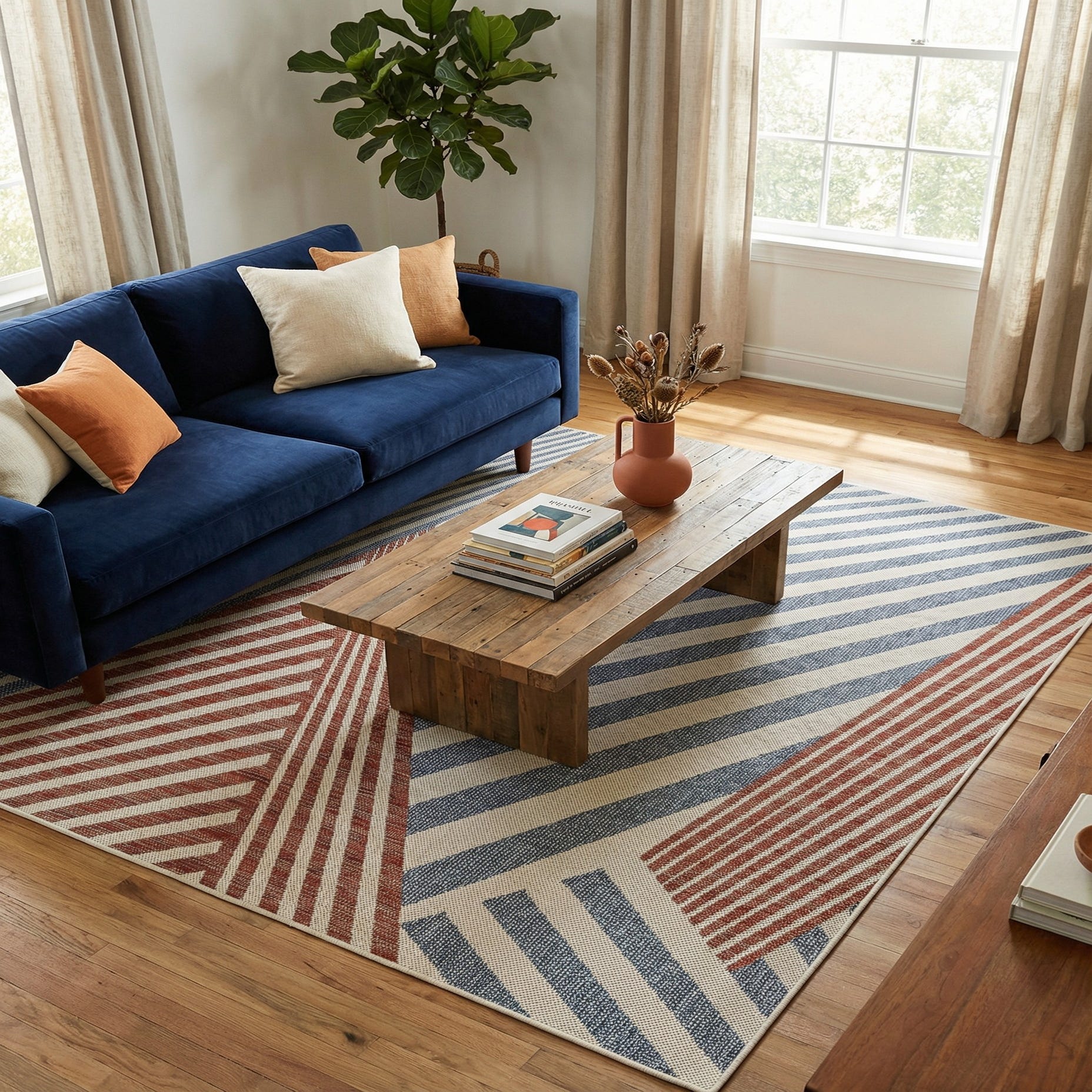 This rug's contemporary appeal and resilient design make it appropriate for various outdoor spaces such as patios, decks, and poolside areas. Its color palette and pattern could complement contemporary, nautical, or rustic decor styles, adding a lively touch to the space while tying together outdoor seating and dining areas.