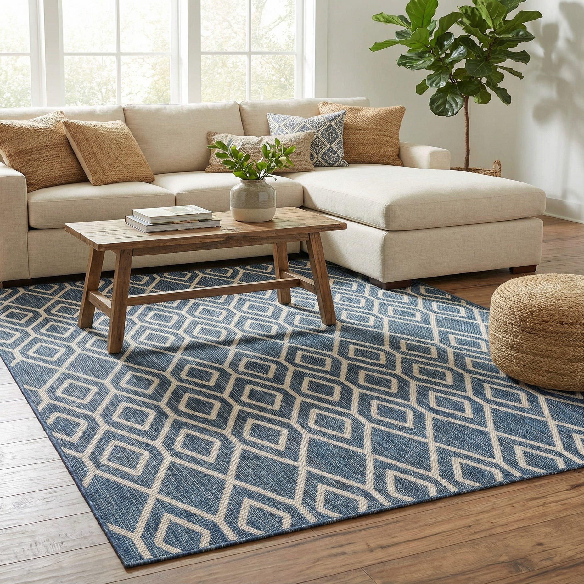 This rug works well on covered patios, sunrooms, and entryways where pattern can energize the space, and it pairs nicely with coastal, modern farmhouse, or contemporary decor. Try it beneath a light-wood dining set or layered over a natural-fiber sisal for contrast, or place it under a neutral sofa and navy accents to reinforce a seaside palette. It also complements wicker and rattan furniture, painted white trim, and linen textiles for a relaxed yet put-together arrangement.