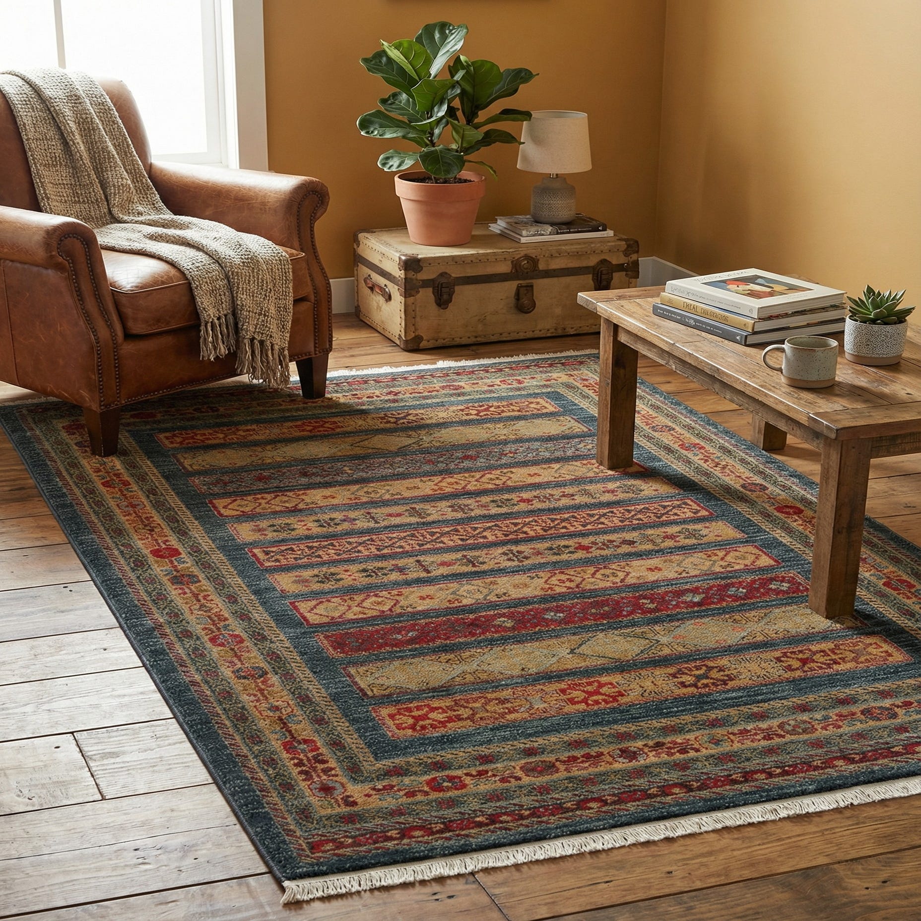 This colorway and pattern work well in a range of interiors: anchor a living room seating area to bring warmth to neutral sofas, place it in a home office for a graphic yet grounded backdrop, or use it in an entry or dining room to introduce organized pattern without competing with existing furnishings. The blue background pairs nicely with warm woods, leather, and linen fabrics, and the layered stripes align easily with furniture lines in both traditional and transitional schemes.