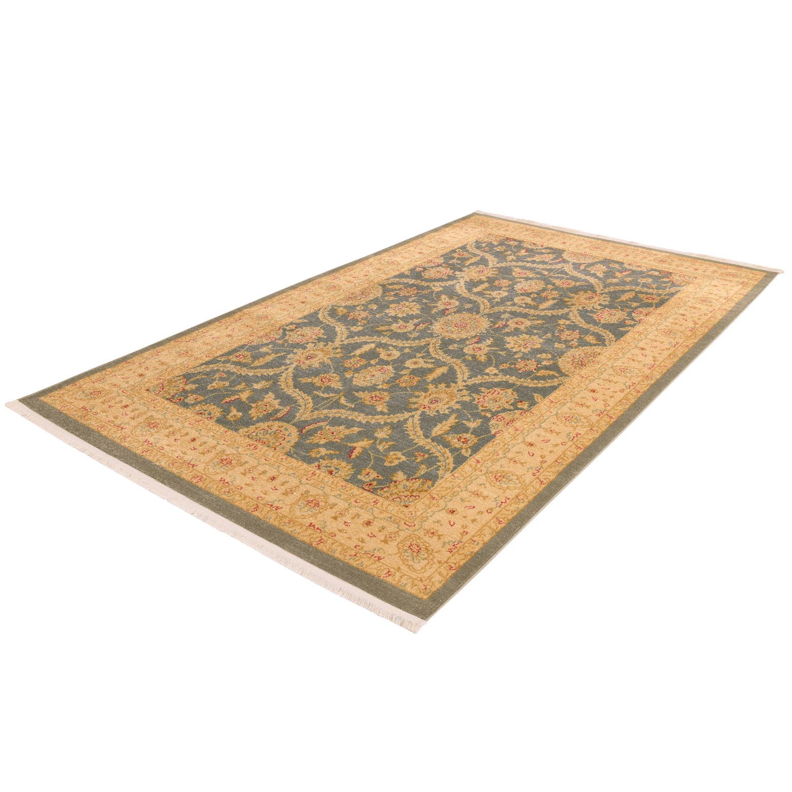 A traditional floral-medallion design plays across a blue field, where scrolling vines and symmetrical blossoms form an elegant, garden-inspired pattern. Soft beige and cream motifs are detailed with light brown shading and small red accents, and a warm beige border frames the composition for a refined, finished look. The overall effect balances pattern and negative space so the rug anchors a room without overwhelming it.
