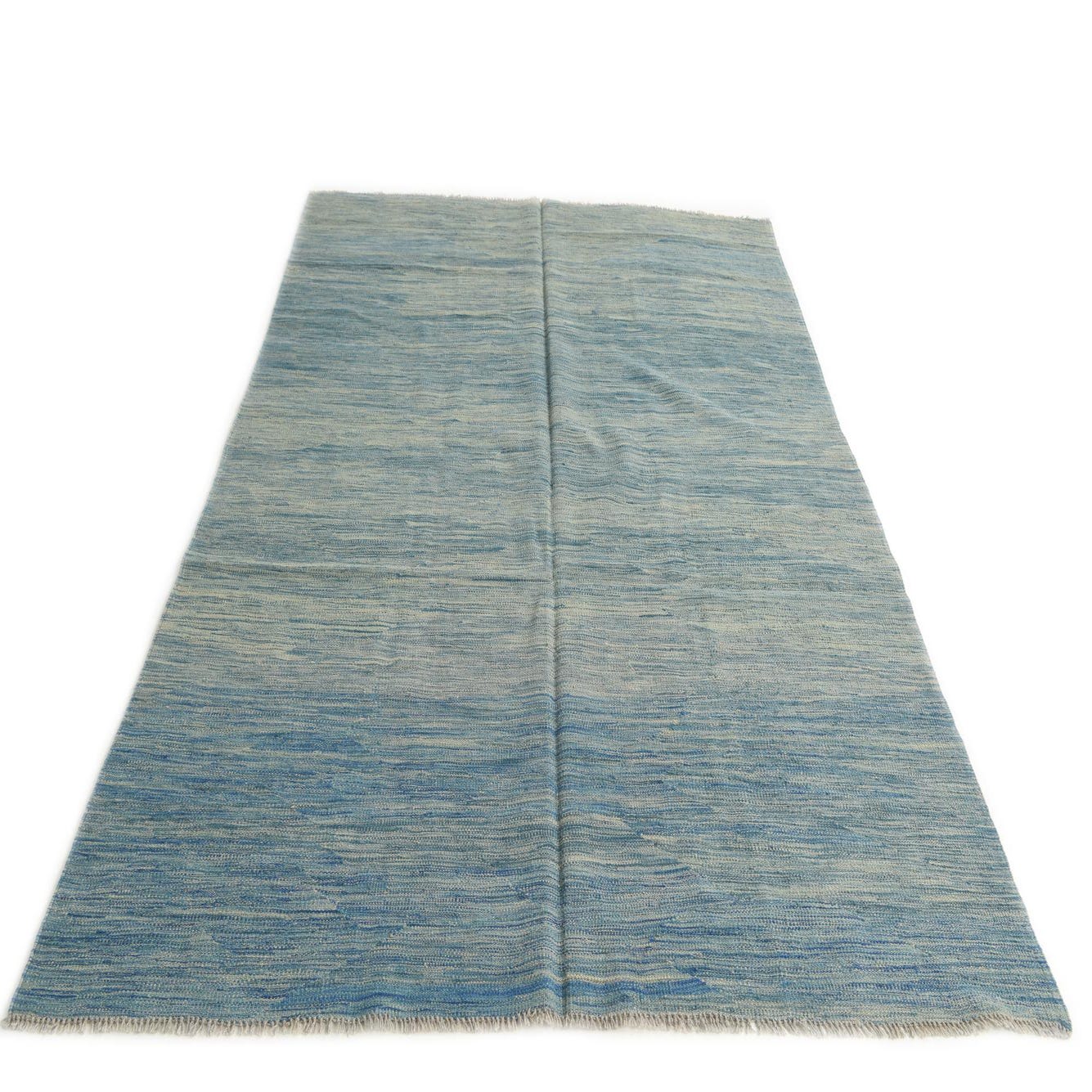 This Kilim Modern collection rug is hand-woven of 100% wool, offering a durable and tactile surface that adds texture and interest to any room. The 5x8 size is versatile for various settings. It features a primarily blue background with subtle beige accents that create a serene and inviting atmosphere. The pattern is understated, showcasing horizontal variegations that give the sense of a calm, rippling effect, versatile for those looking to integrate the rug into both minimalist and busier decors.