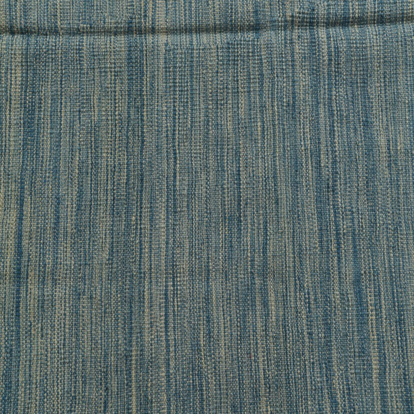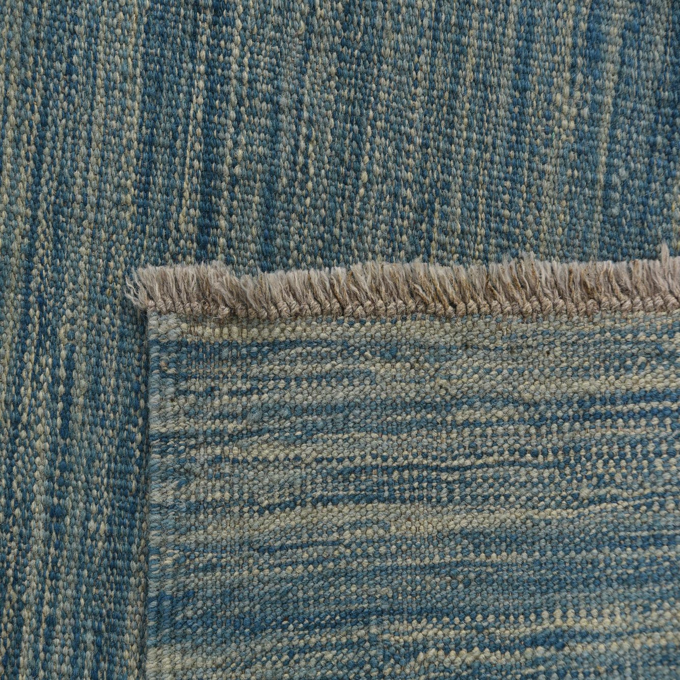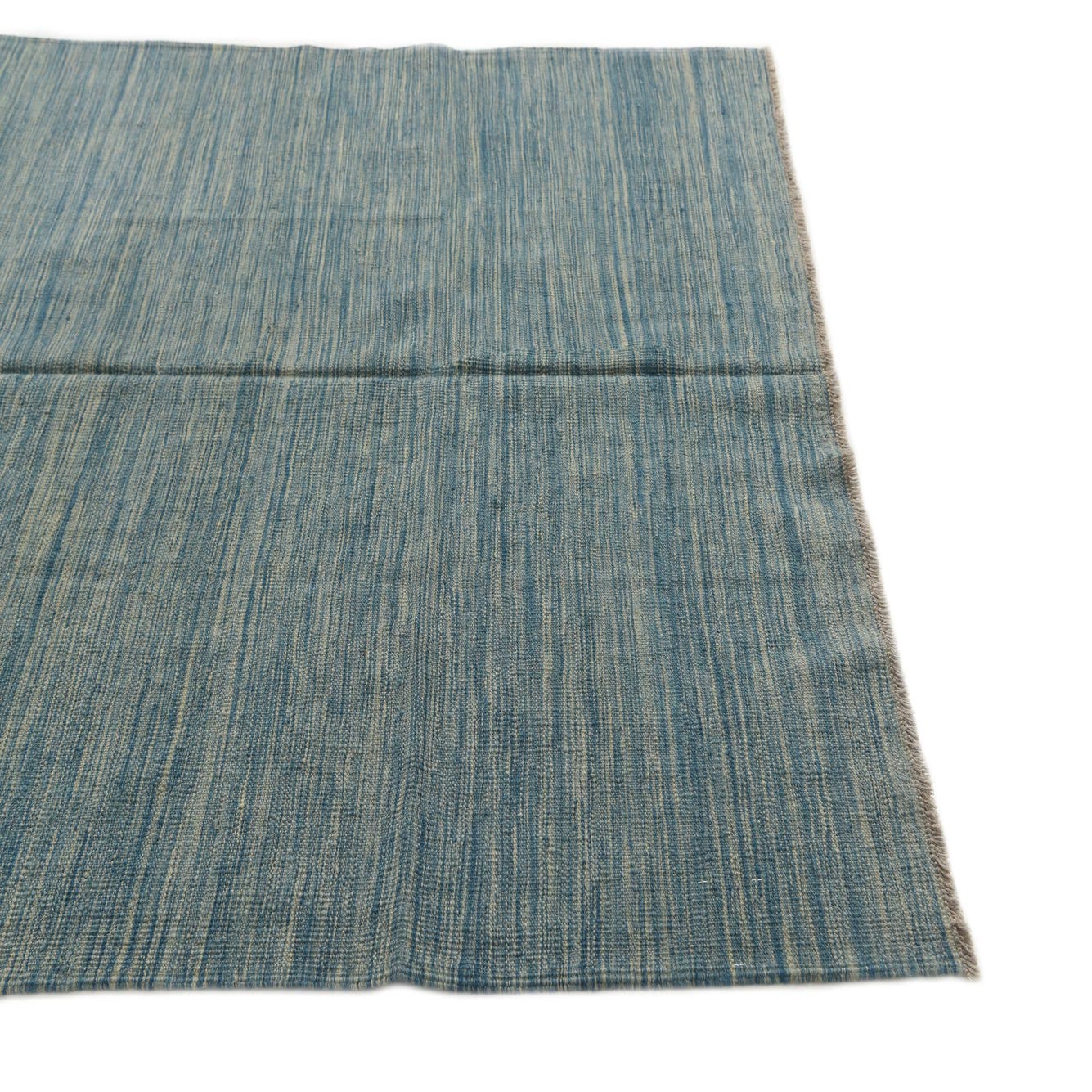 A 5x8 rectangular Kilim Modern area rug in varying shades of blue, featuring a flatweave striped pattern.