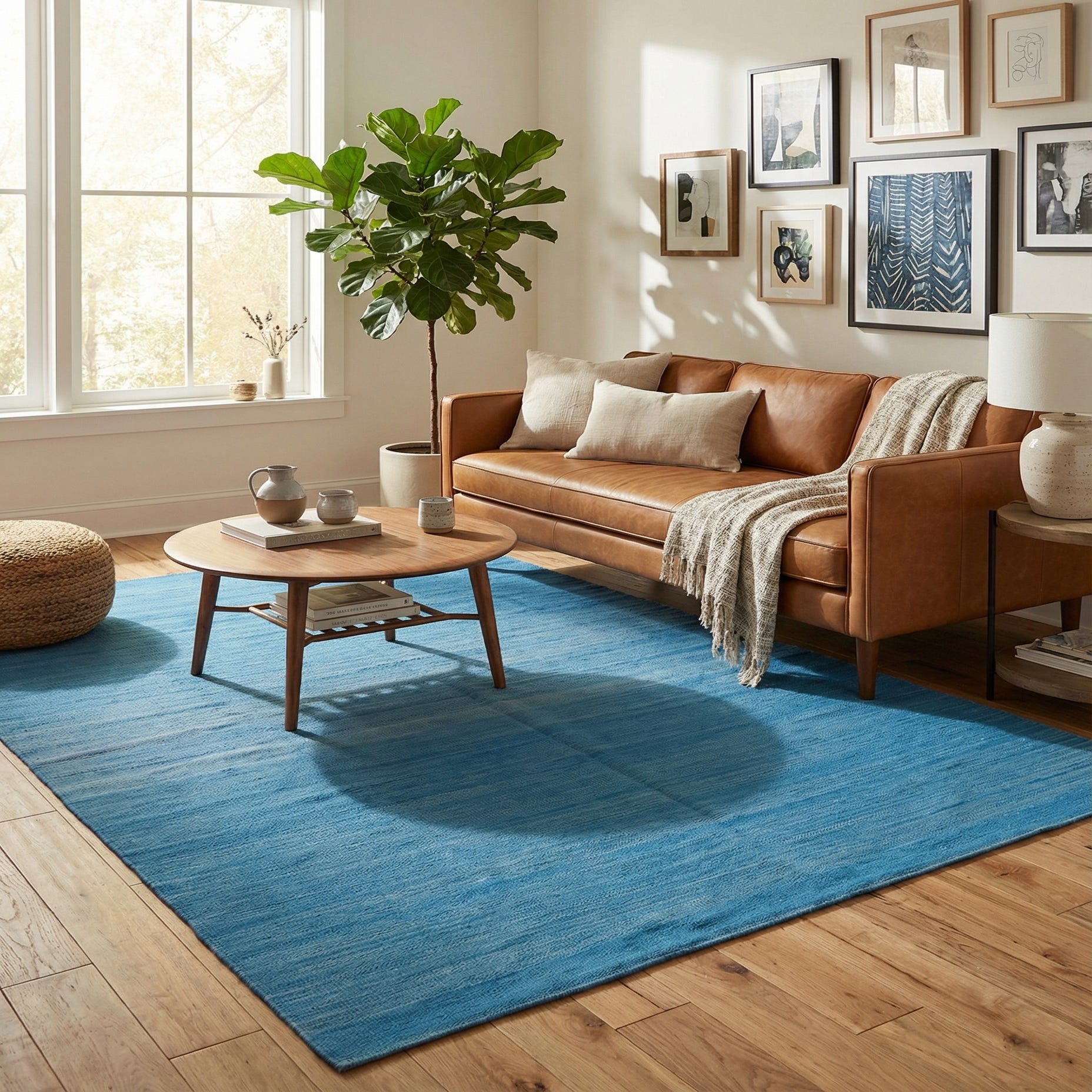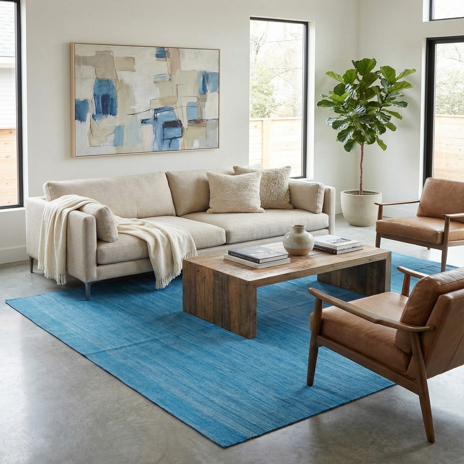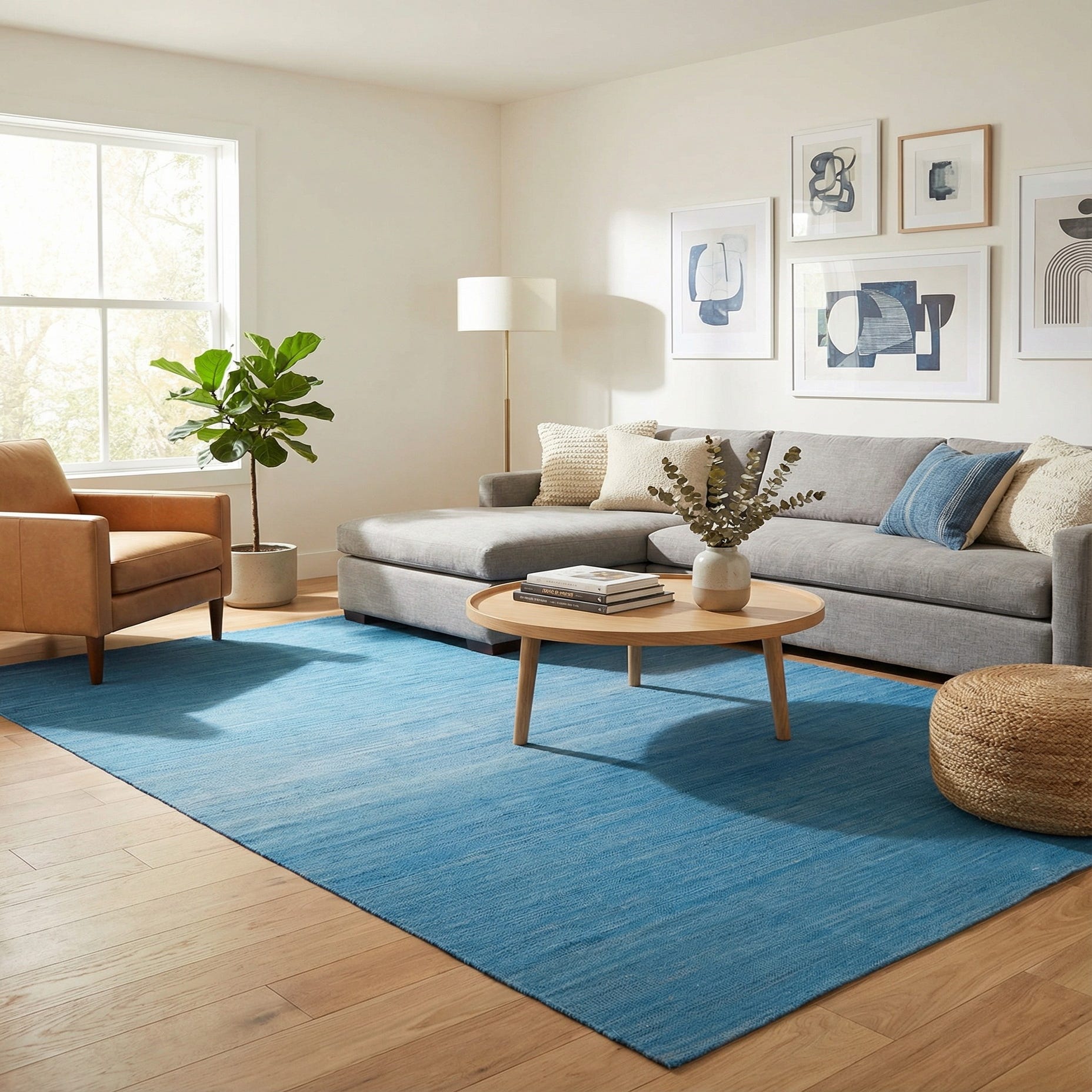 With its streamlined aesthetic, this rug is a versatile addition to any space requiring a touch of understated sophistication. It aligns seamlessly with contemporary and minimalist interiors, brings a calming hue to coastal-themed decors, and can serve as a grounding element in eclectic or bohemian settings. The cohesive color palette allows for easy pairing with a variety of color schemes from neutral to vibrant. The rug's size and understated design make it suitable for areas such as living rooms, home offices, or under dining tables, providing an elegant yet unassuming foundation for any room's design.