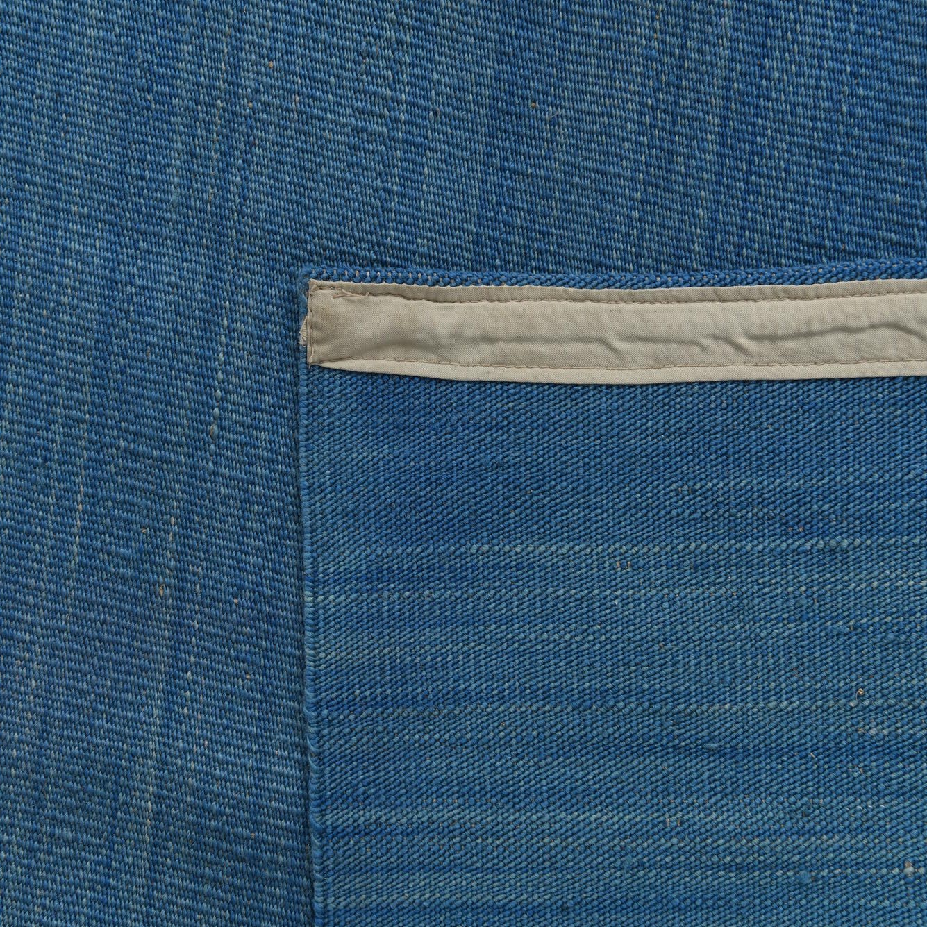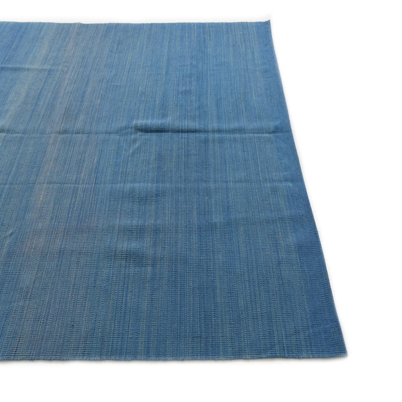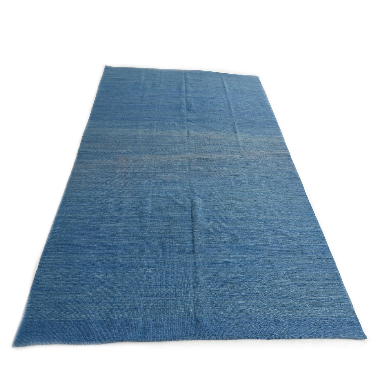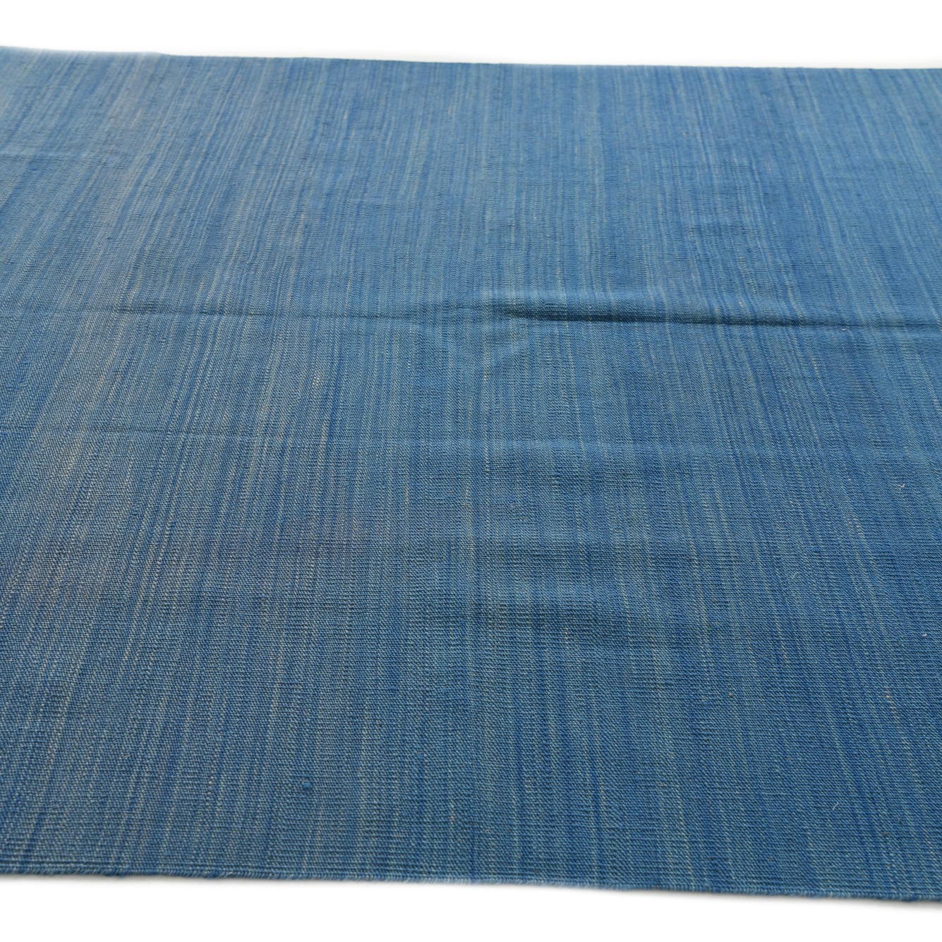The Kilim Modern collection presents a refined 5x8 hand-woven rug crafted from 100% wool. Displaying a solid blue background, the piece showcases subtle tonal variations that speak to its artisanal quality and handcrafted nature. The texture is inviting, offering a natural, tactile experience underfoot owing to its wool construction.