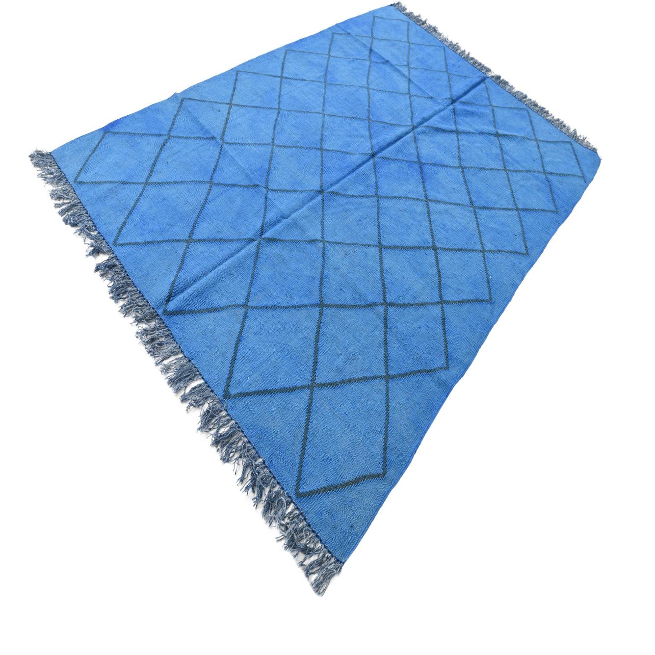 A 5x8 rectangular blue wool rug with a black diamond tribal pattern and fringed edges, suitable for a living room.